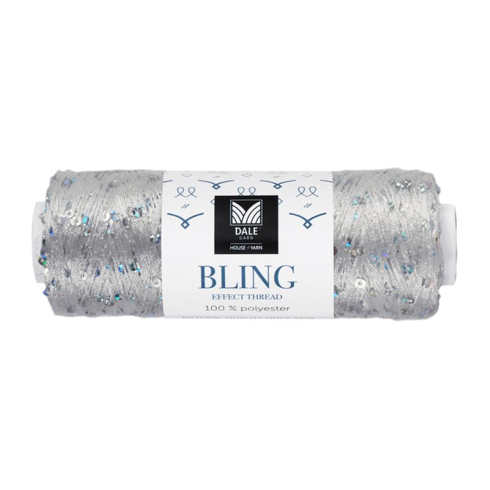 Bling är ett tunt effektgarn som kan användas tillsammans med andra garner från Du Store Alpakka, från det fluffiga Pus-garnet till den tunnaste Air-kvaliteten. Garnet är så tunt att det inte påverkar stickfastheten. Det är 5 cm mellan varje paljett. Bling Effektgarn är perfekt att använda på kanter, som detalj eller som ett inslag i mönsterstickningen, eller som en glittrande effekt i hela plagget. Det är fascinerande att se hur stickningen byter karaktär beroende på vilket garn och vilken färg Bling används tillsammans med.