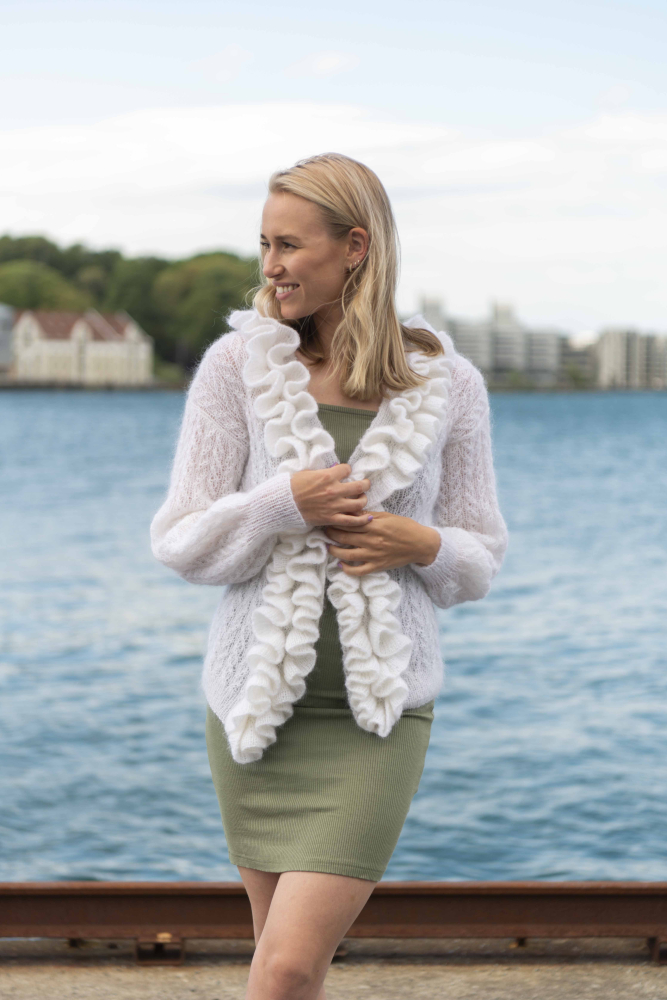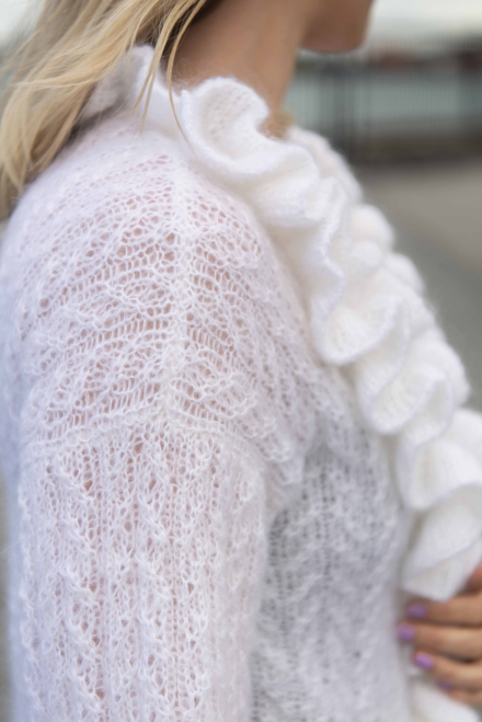 Ljuvlig strukturmönstrad kofta med volanger. Koftan stickas nerifrån och upp i dubbelt garn Kid Mohair.