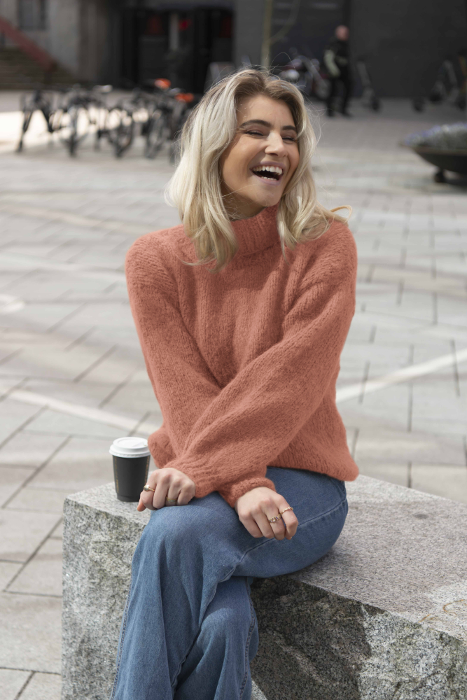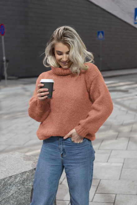 Furu Tröjan är en mjuk och härlig jumper med hög hals och påstickade ärmar – perfekt på kyliga vårmorgnar!