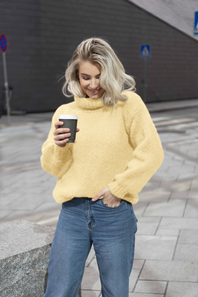 Furu Tröjan är en mjuk och härlig jumper med hög hals och påstickade ärmar – perfekt på kyliga vårmorgnar!
