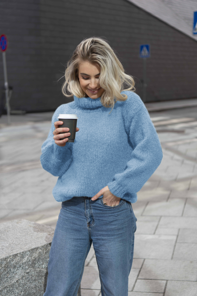 Furu Tröjan är en mjuk och härlig jumper med hög hals och påstickade ärmar – perfekt på kyliga vårmorgnar!