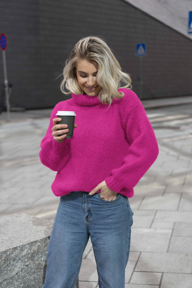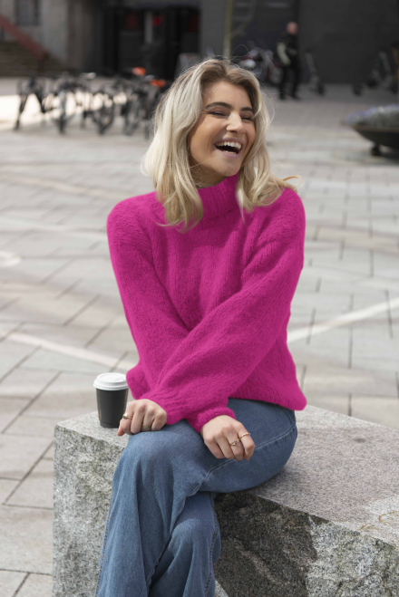 Furu Tröjan är en mjuk och härlig jumper med hög hals och påstickade ärmar – perfekt på kyliga vårmorgnar!