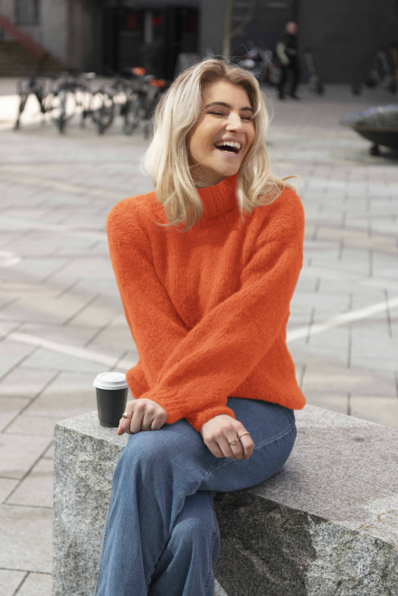 Furu Tröjan är en mjuk och härlig jumper med hög hals och påstickade ärmar – perfekt på kyliga vårmorgnar!