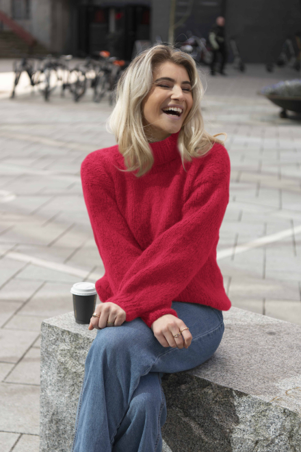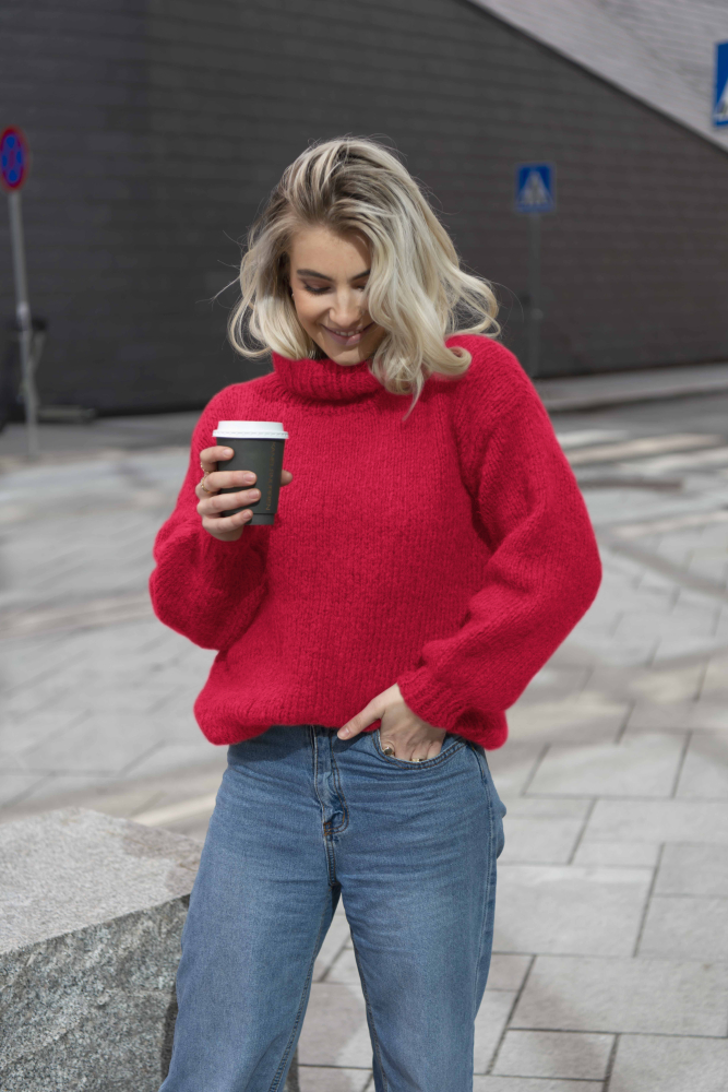 Furu Tröjan är en mjuk och härlig jumper med hög hals och påstickade ärmar – perfekt på kyliga vårmorgnar!