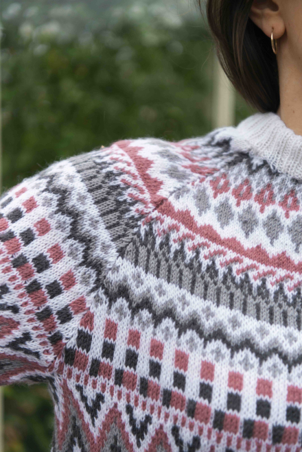 Du kan ändra färg på stickpaketet - välj först den storlek du vill sticka så visas färgvalen nedanför. OBS! Stickmönstret levereras alltid i stickpaketets originalfärger: vit, mörk hallon, grå och mellangrå
