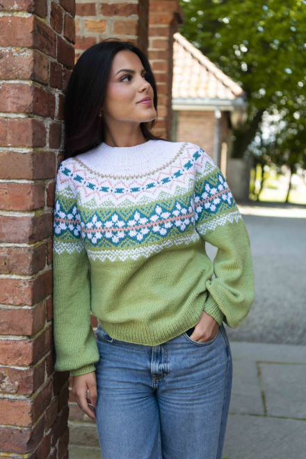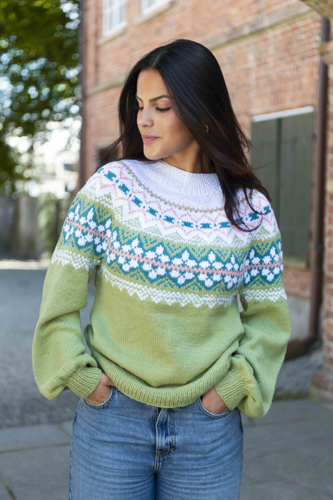 Du kan ändra färg på stickpaketet - välj först den storlek du vill sticka så visas färgvalen nedanför. OBS! Stickmönstret levereras alltid i stickpaketets originalfärger: ljusgrön, vit, sjögrön och aprikos