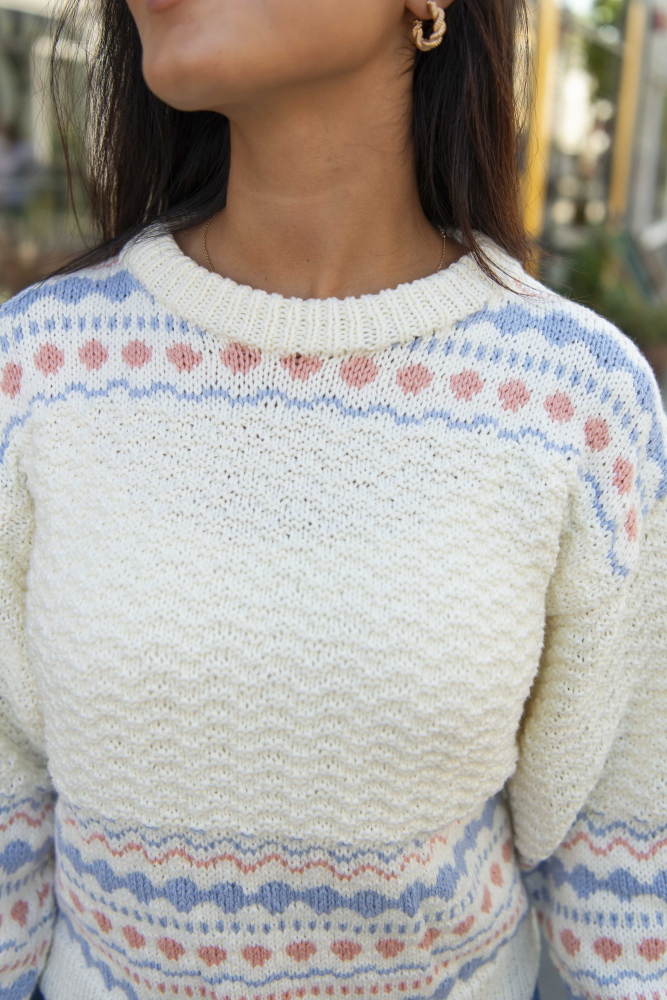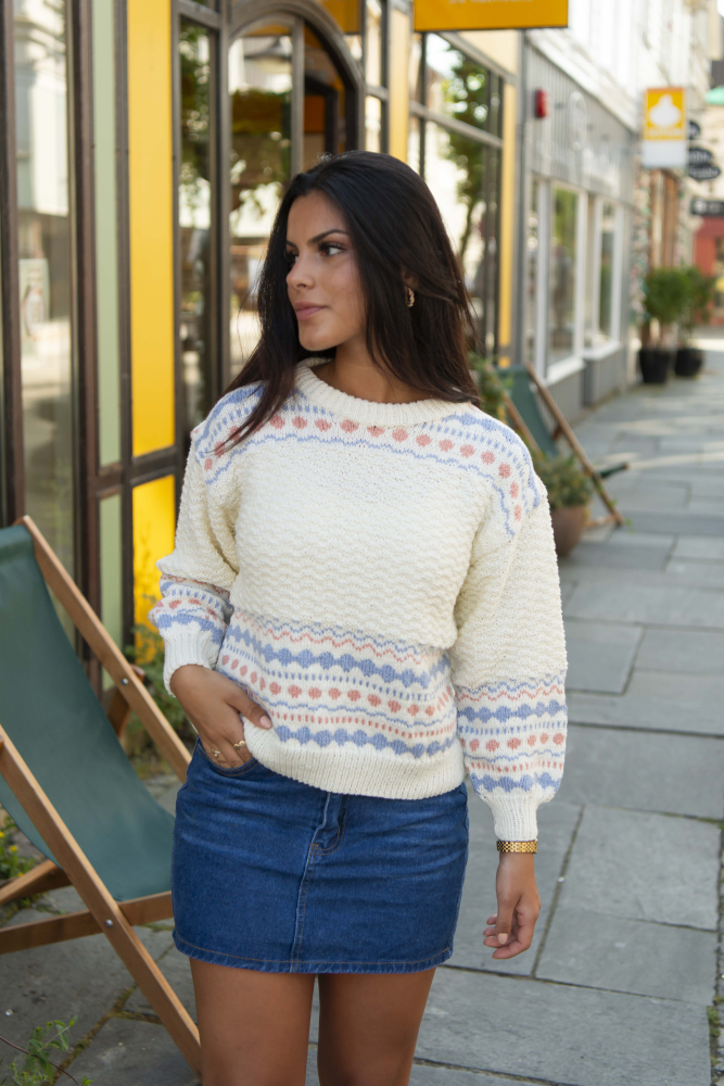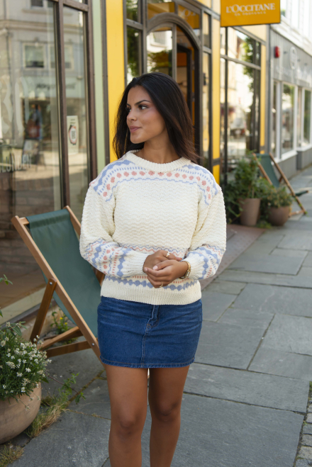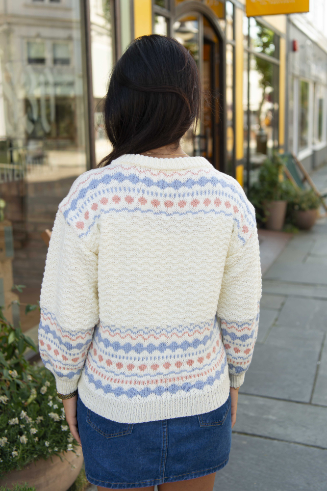 Du kan ändra färg på stickpaketet - välj först den storlek du vill sticka så visas färgvalen nedanför. OBS! Stickmönstret levereras alltid i stickpaketets originalfärger: natur, ljusblå och aprikos