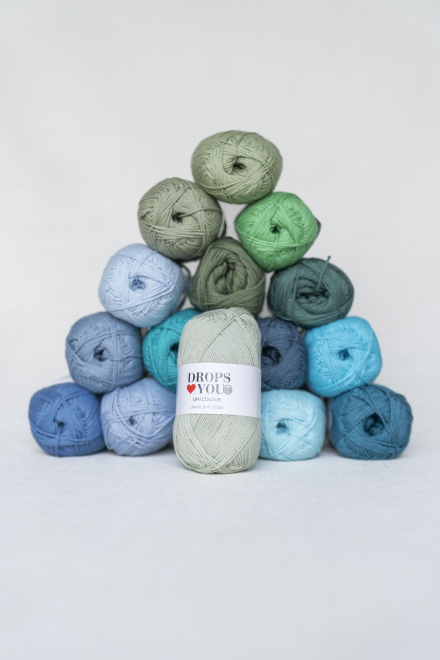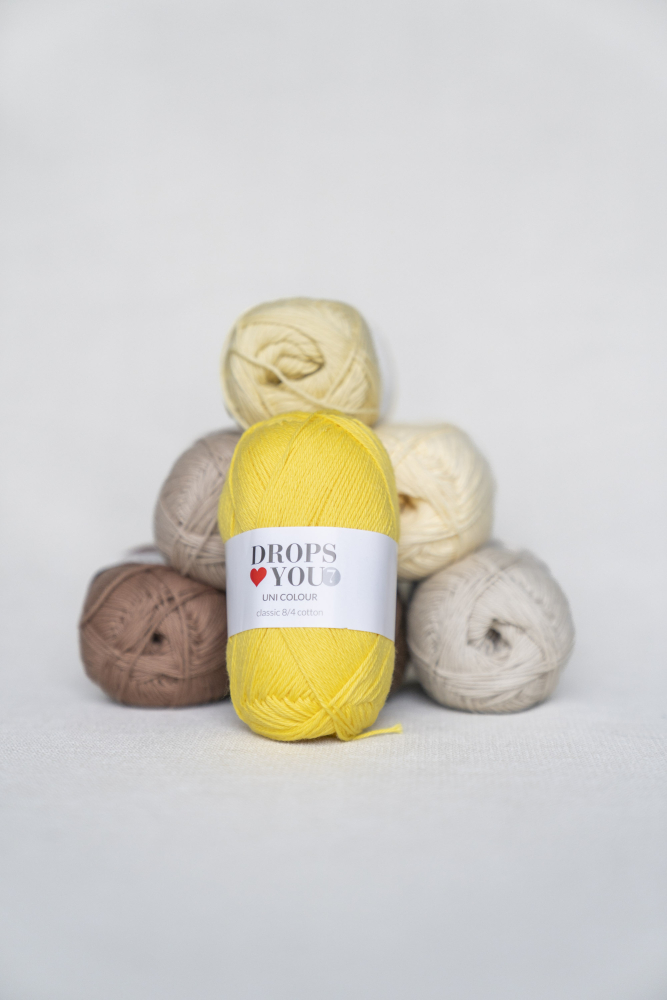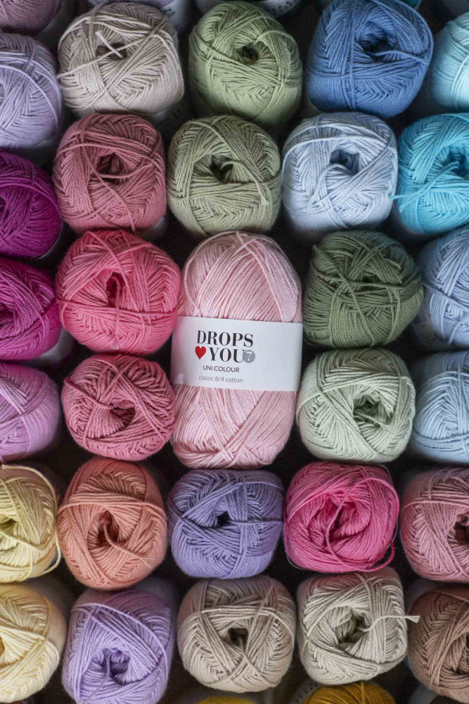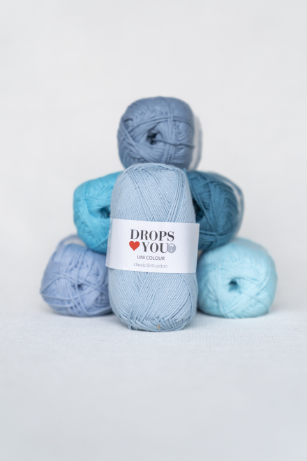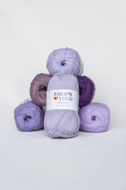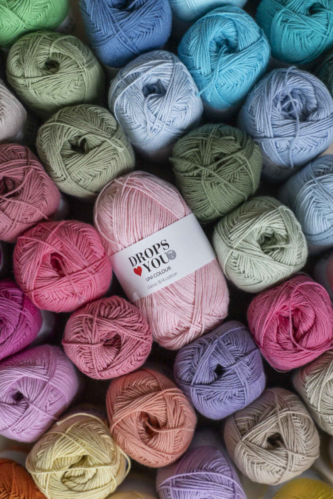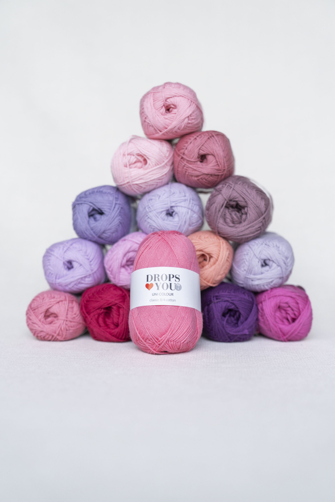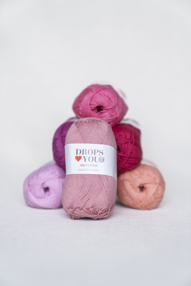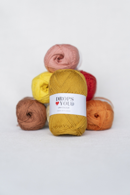 DROPS ♥ You #7 är en klassisk 8/4-kvalitet i ren bomull. Härliga färger som är perfekta att leka med, de kan kombineras på oändligt många sätt – garnet är billigt och ett perfekt val för större inredningsprojekt som filtar, mattor och kuddar. Självklart passar det även till andra typer av projekt som sommarkläder, accessoarer och söta små leksaker till barnen. DROPS ♥ You-garnet kan tvättas i maskin, vilket gör att det passar bra till vardagsplagg – och barnkläder!