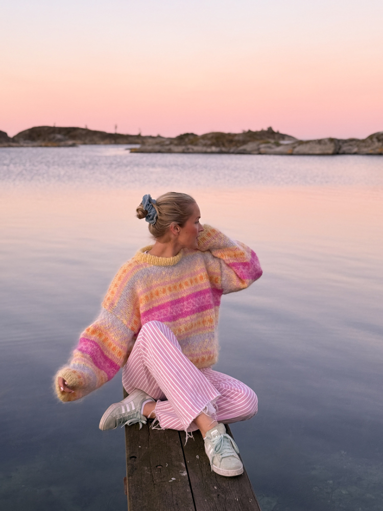 Du kan ändra färg på stickpaketet - välj först den storlek du vill sticka så visas färgvalen nedanför. OBS! Stickmönstret levereras alltid i stickpaketets originalfärger: lavendel, gul, djup röd, orange, pärongrön och honungsmelon