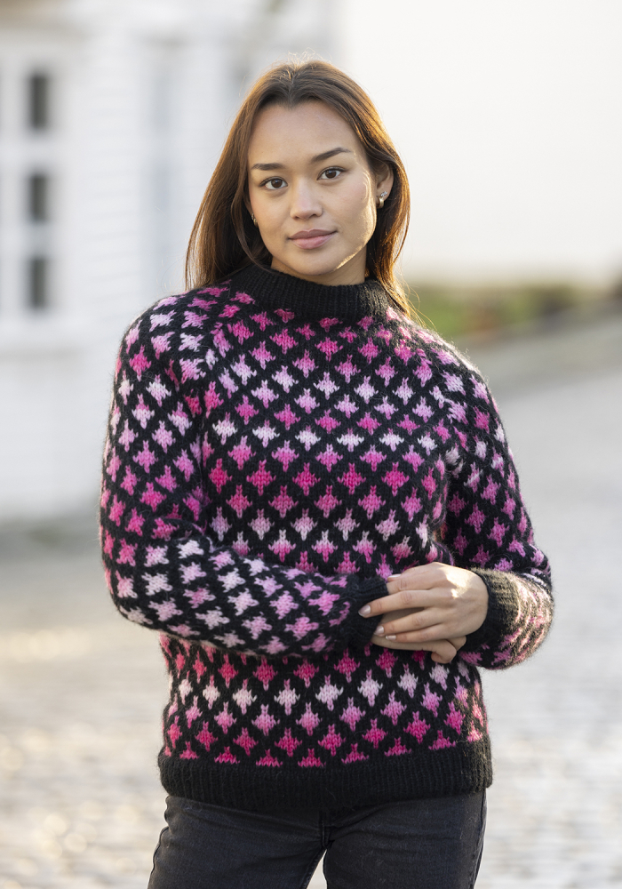 Du kan ändra färg på stickpaketet - välj först den storlek du vill sticka så visas färgvalen nedanför. OBS! Stickmönstret levereras alltid i stickpaketets originalfärger: svart och multi rosa
