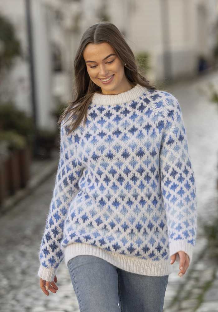Du kan ändra färg på stickpaketet - välj först den storlek du vill sticka så visas färgvalen nedanför. OBS! Stickmönstret levereras alltid i stickpaketets originalfärger: vit och multi blå
