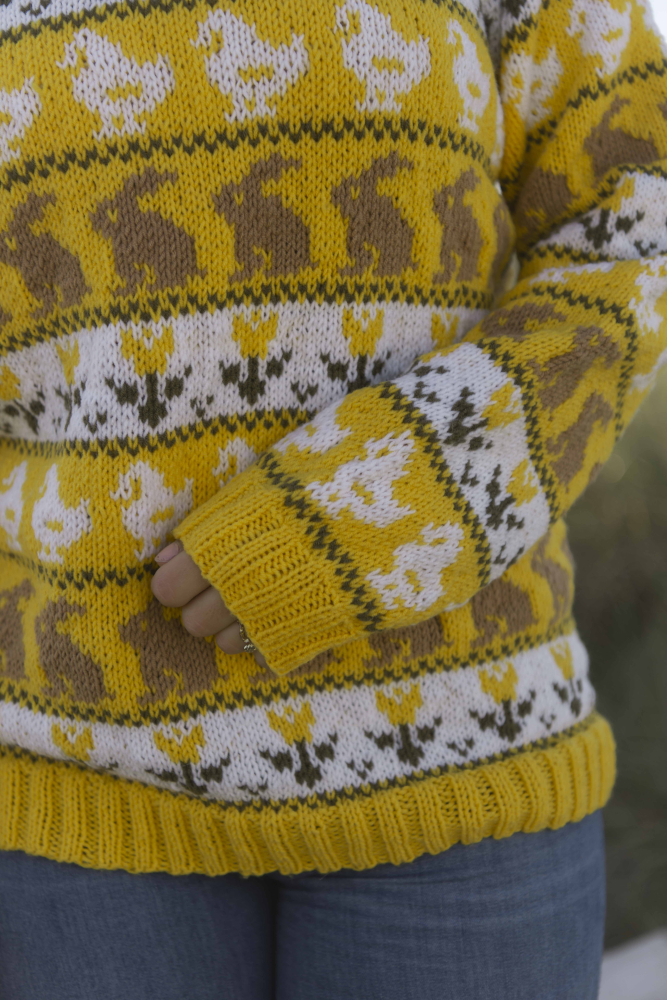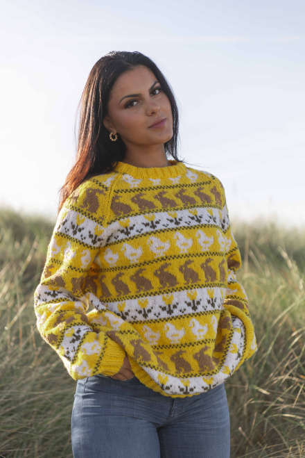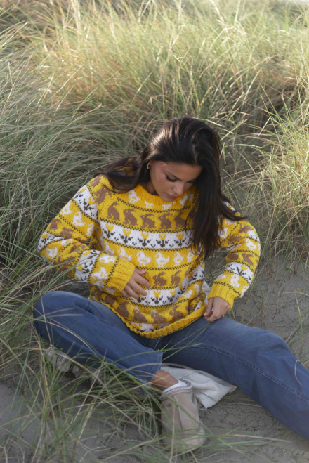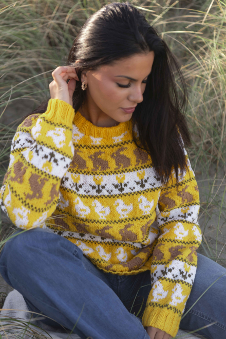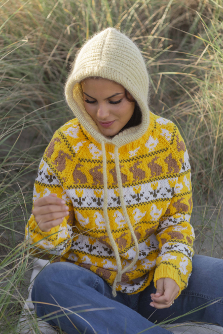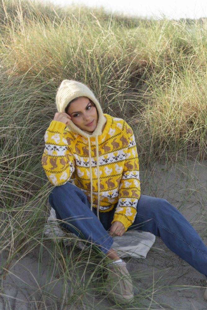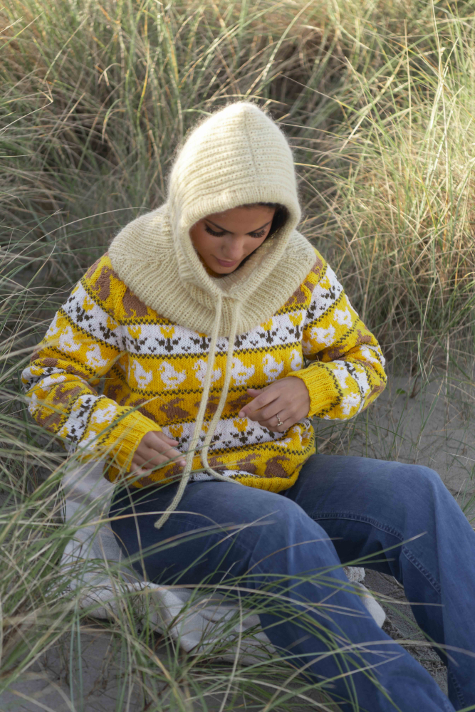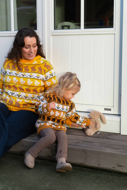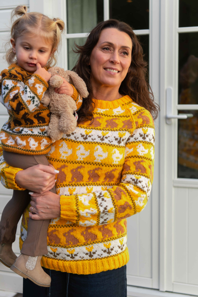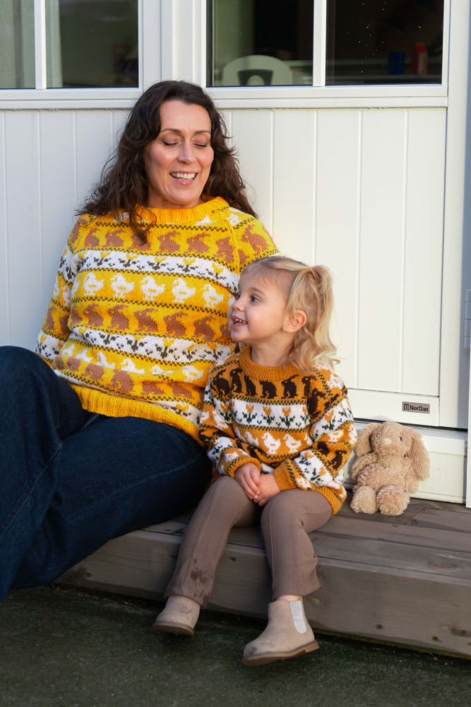 Du kan ändra färg på stickpaketet - välj först den storlek du vill sticka så visas färgvalen nedanför. OBS! Stickmönstret levereras alltid i stickpaketets originalfärg: solros, mörk oliv, vit och nougat