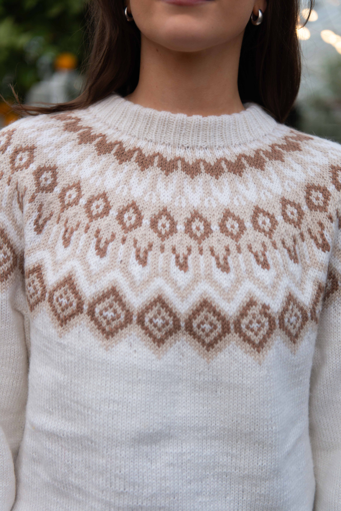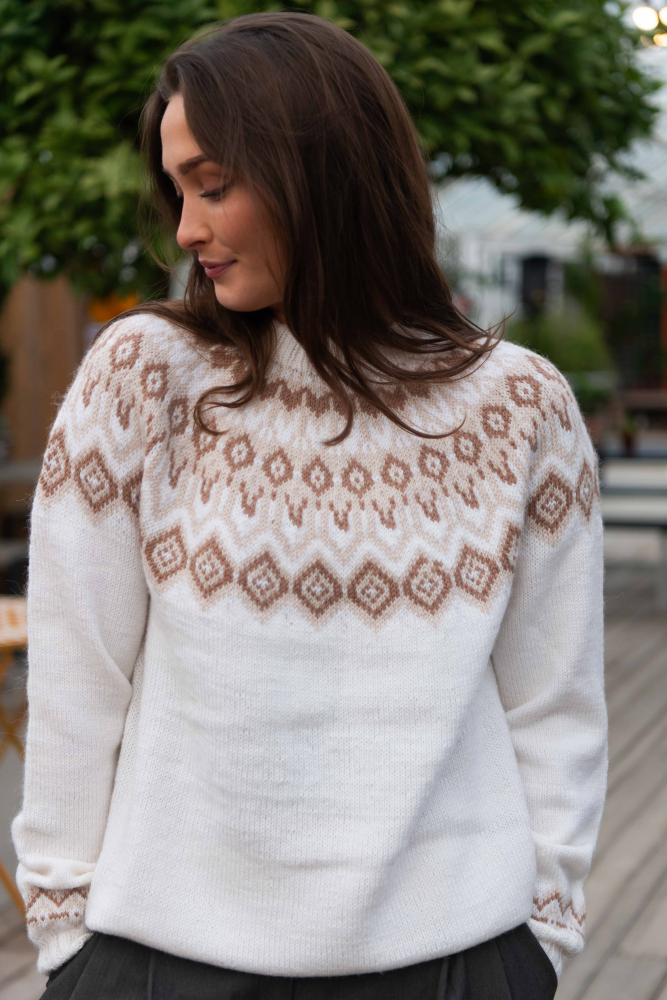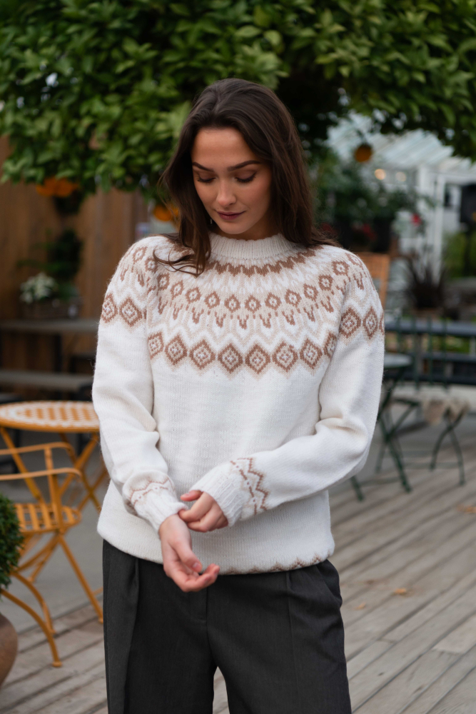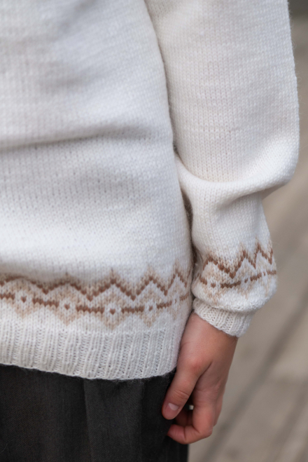 Du kan ändra färg på stickpaketet - välj först den storlek du vill sticka så visas färgvalen nedanför. OBS! Stickmönstret levereras alltid i stickpaketets originalfärg: offwhite, ljusbeige melange och mocka mousse