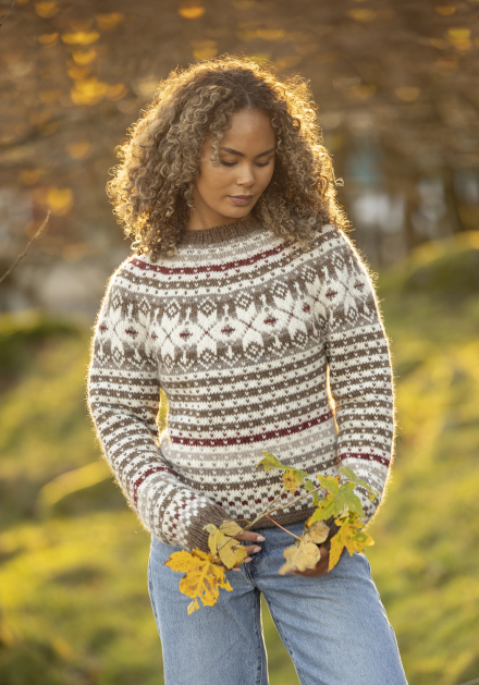 Du kan ändra färg på stickpaketet - välj först den storlek du vill sticka så visas färgvalen nedanför. OBS! Stickmönstret levereras alltid i stickpaketets originalfärger: naturvit, brun, beige, ljusbeige, mörkröd