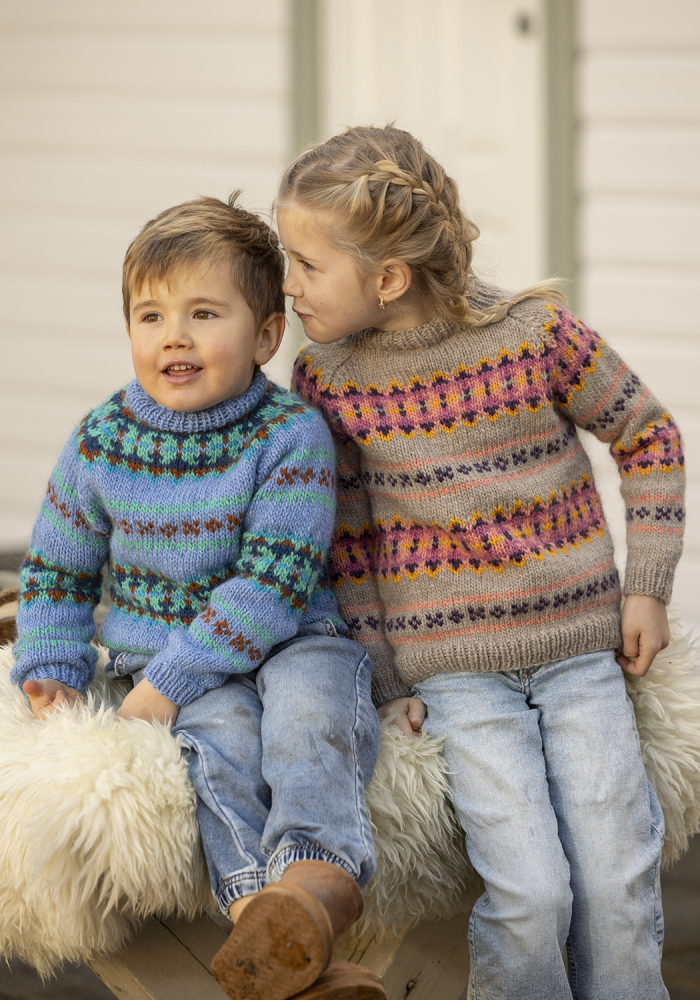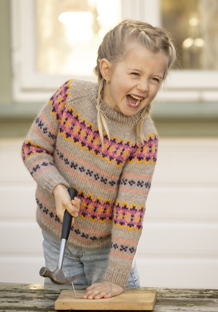 Du kan ändra färg på stickpaketet - välj först den storlek du vill sticka så visas färgvalen nedanför. OBS! Stickmönstret levereras alltid i stickpaketets originalfärger: ljusbeige, lila, korall, mandarin och rosa