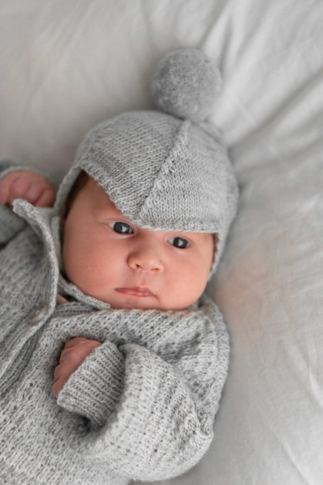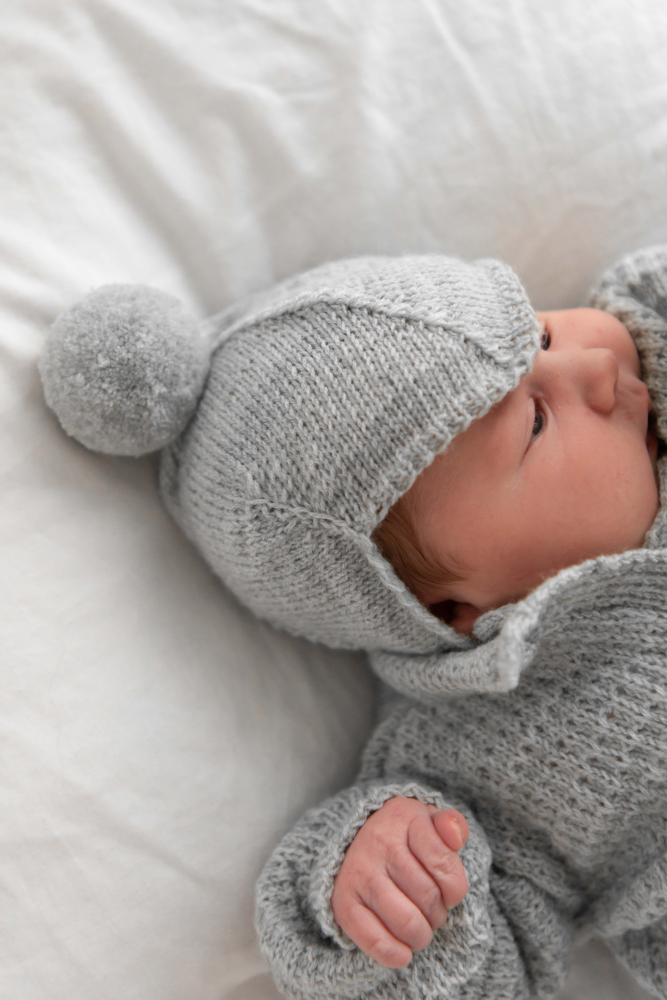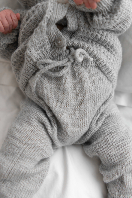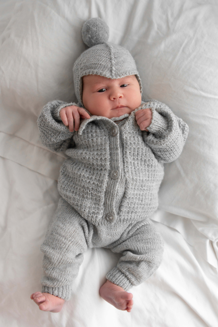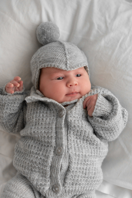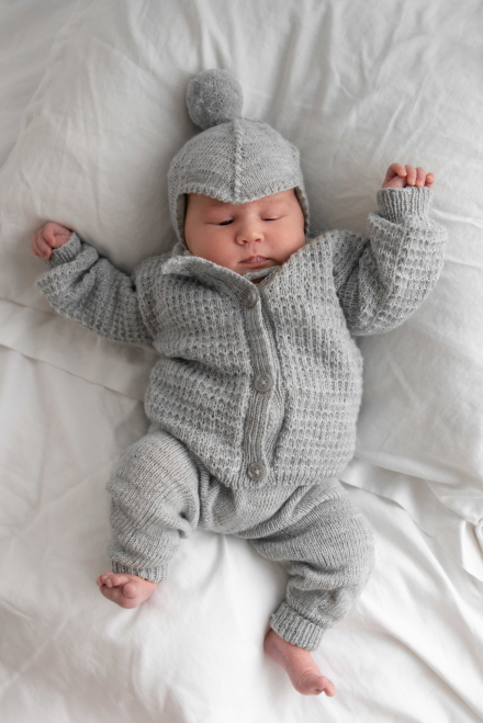 Kofta med strukturmönster samt slätstickad byxa och mössa.