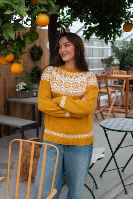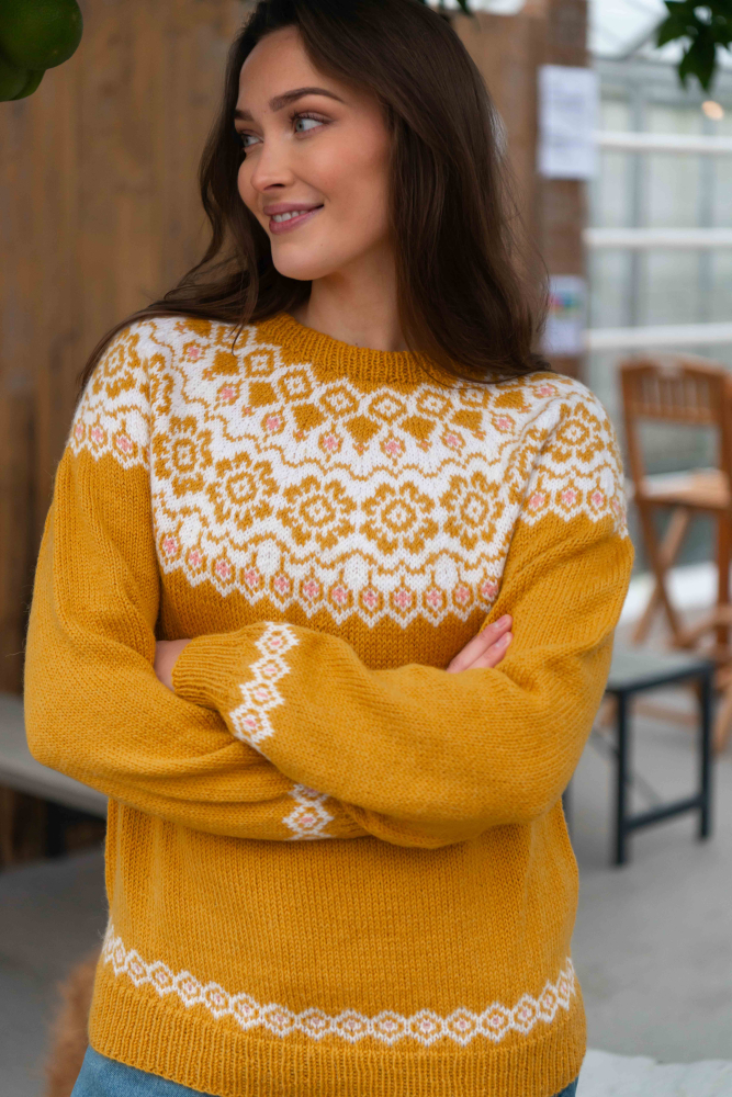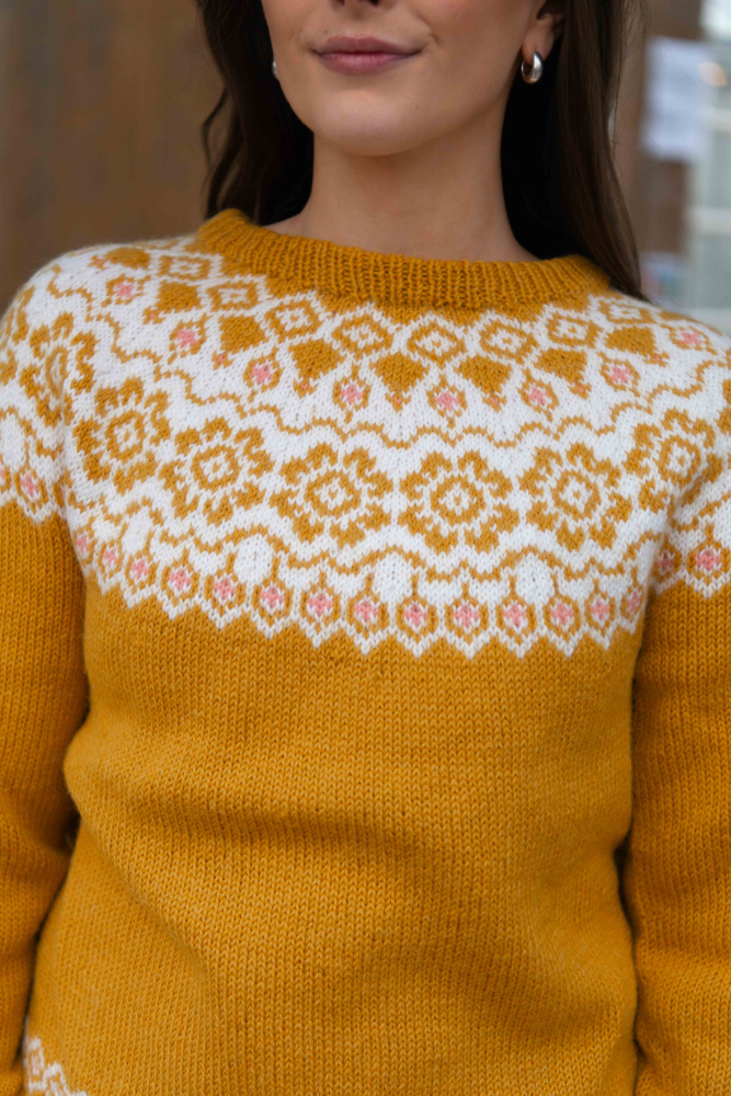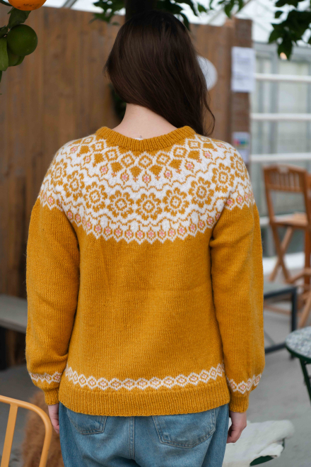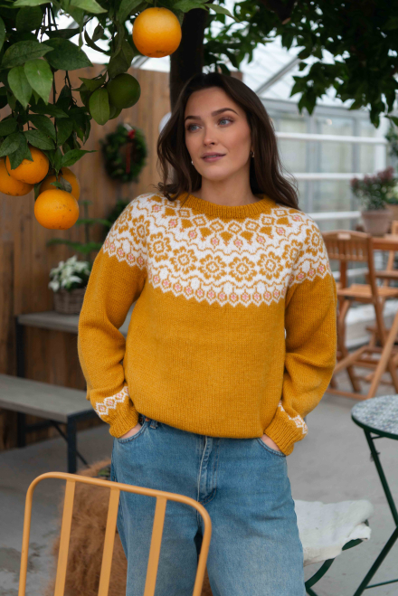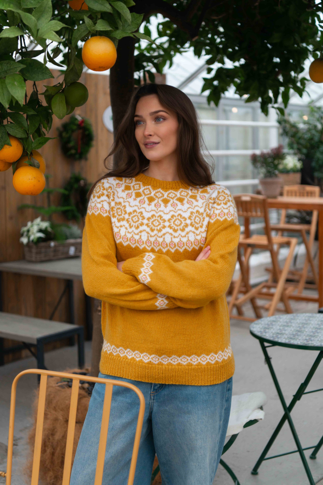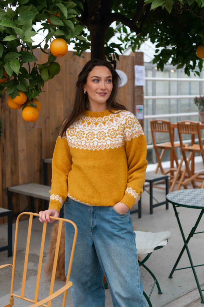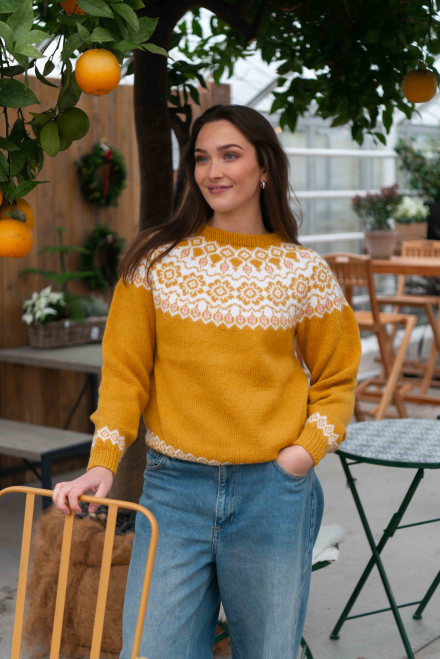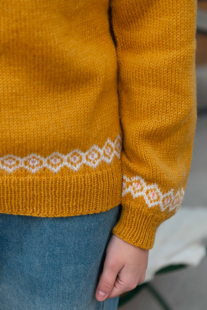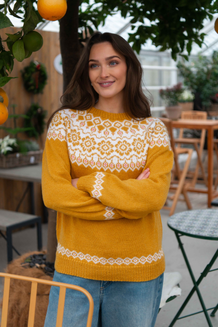 Du kan ändra färg på stickpaketet - välj först den storlek du vill sticka så visas färgvalen nedanför. OBS! Stickmönstret levereras alltid i stickpaketets originalfärg: solros, vit och ljus korall