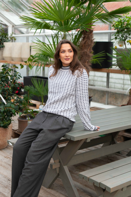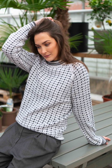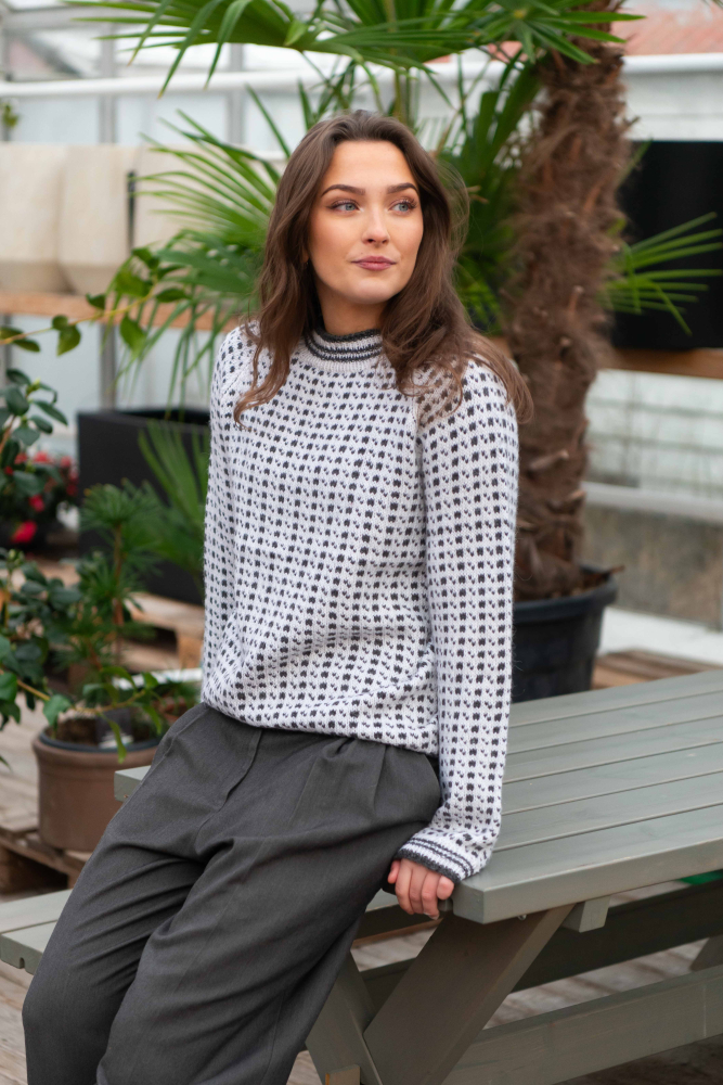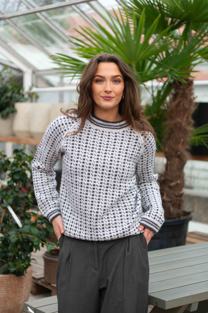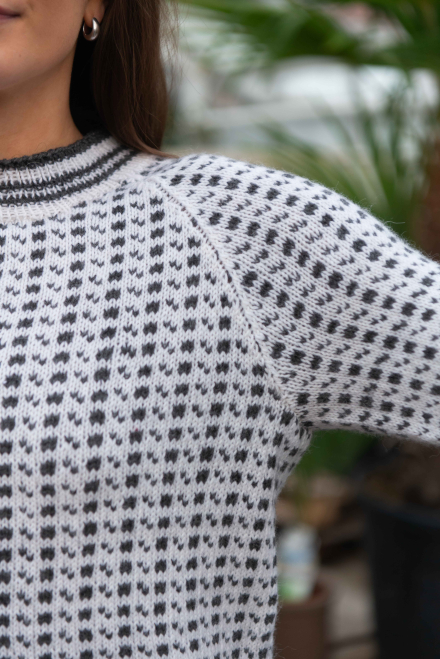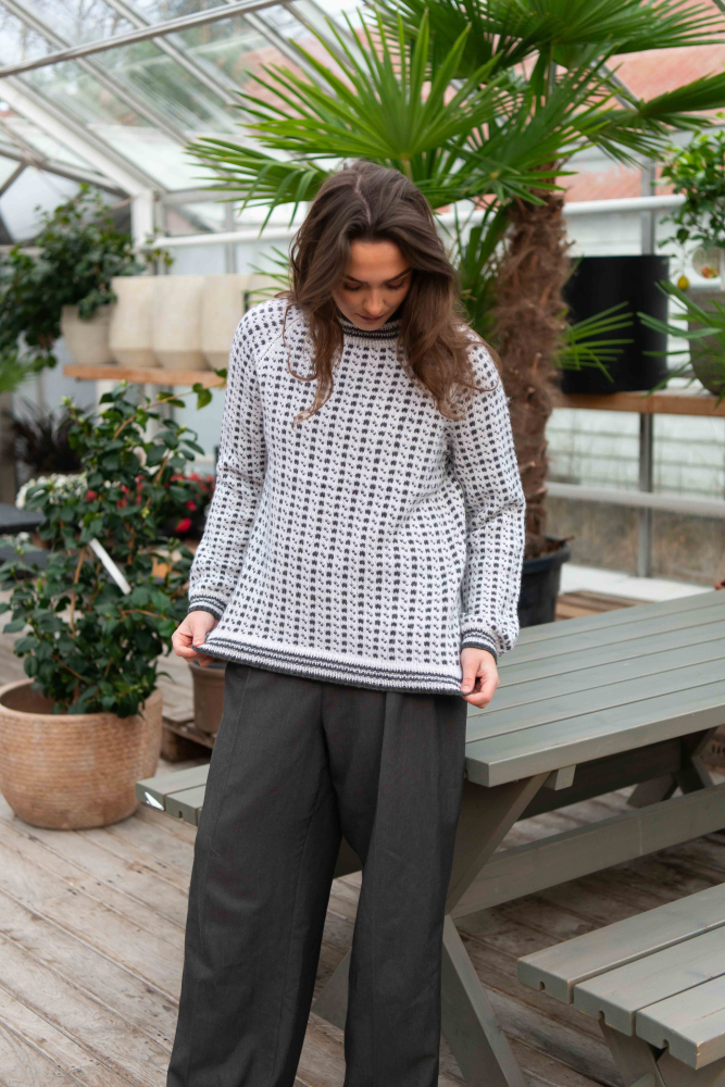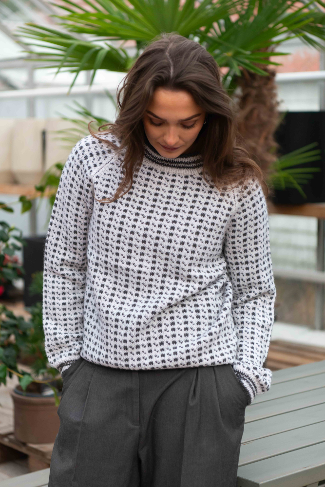 Du kan ändra färg på stickpaketet - välj först den storlek du vill sticka så visas färgvalen nedanför. OBS! Stickmönstret levereras alltid i stickpaketets originalfärg: vit och grafitgrå