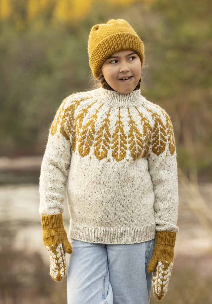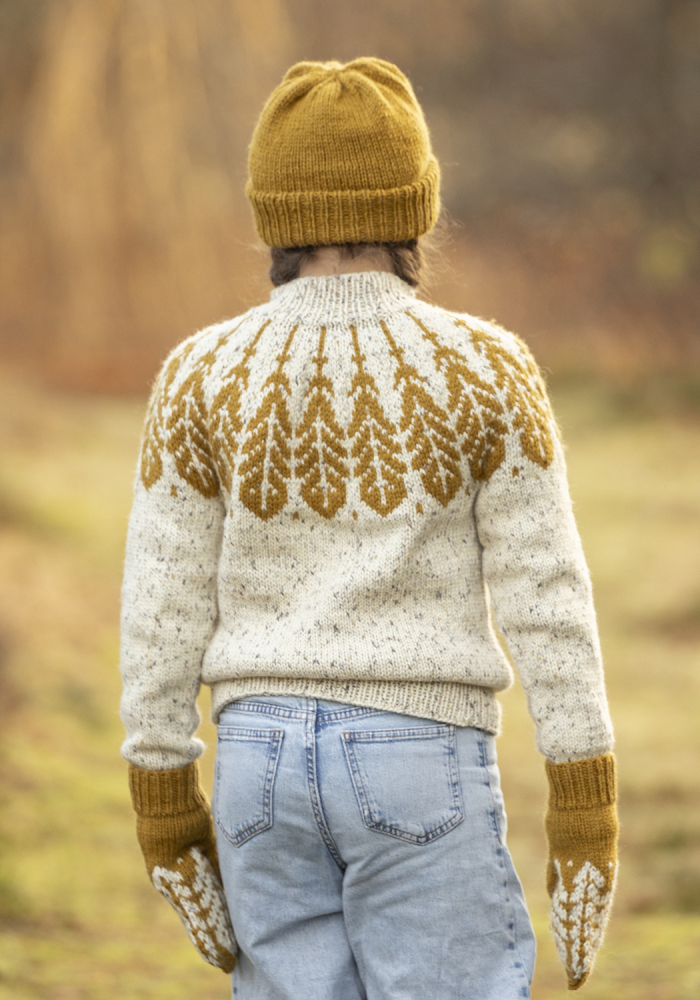 Du kan ändra färg på stickpaketet - välj först den storlek du vill sticka så visas färgvalen nedanför. OBS! Stickmönstret levereras alltid i stickpaketets originalfärg: brun print och senap