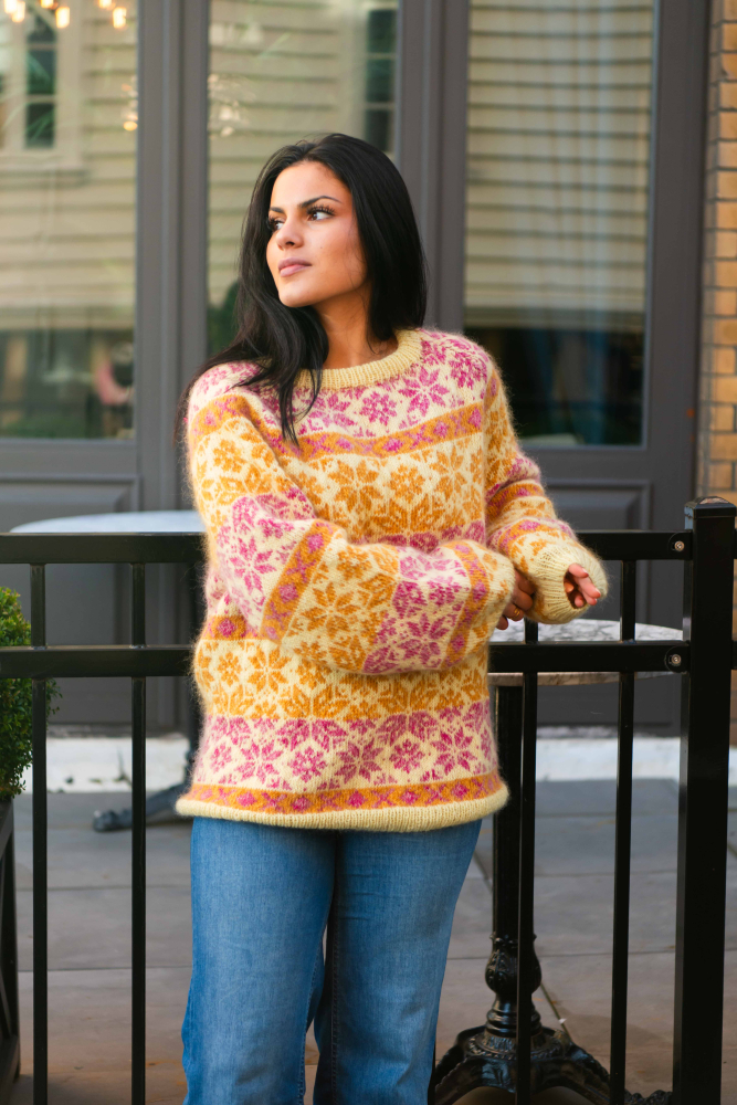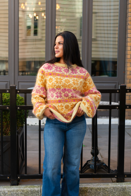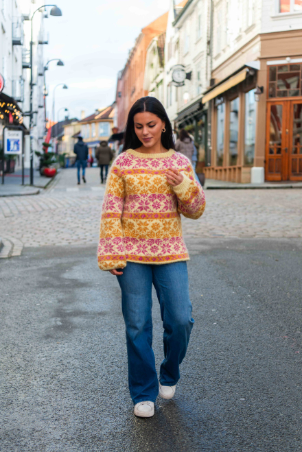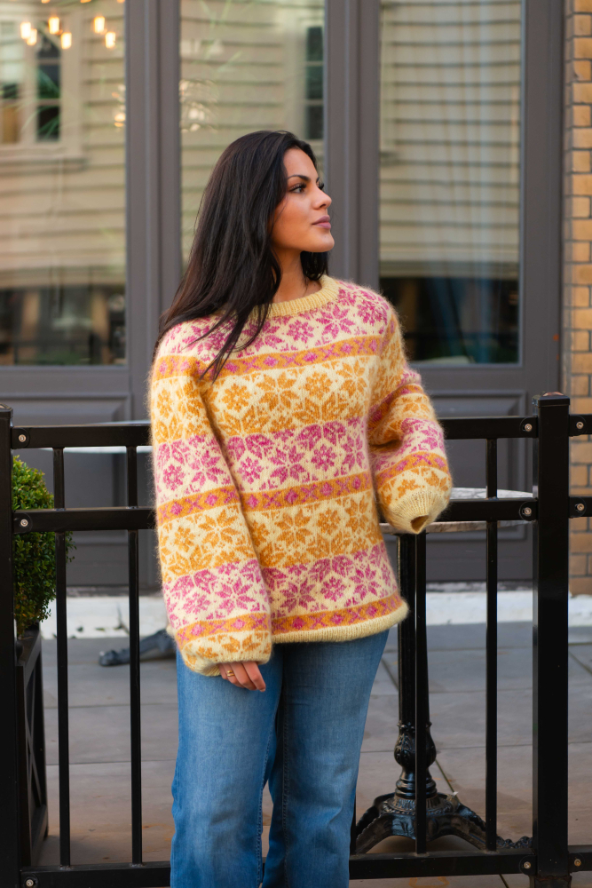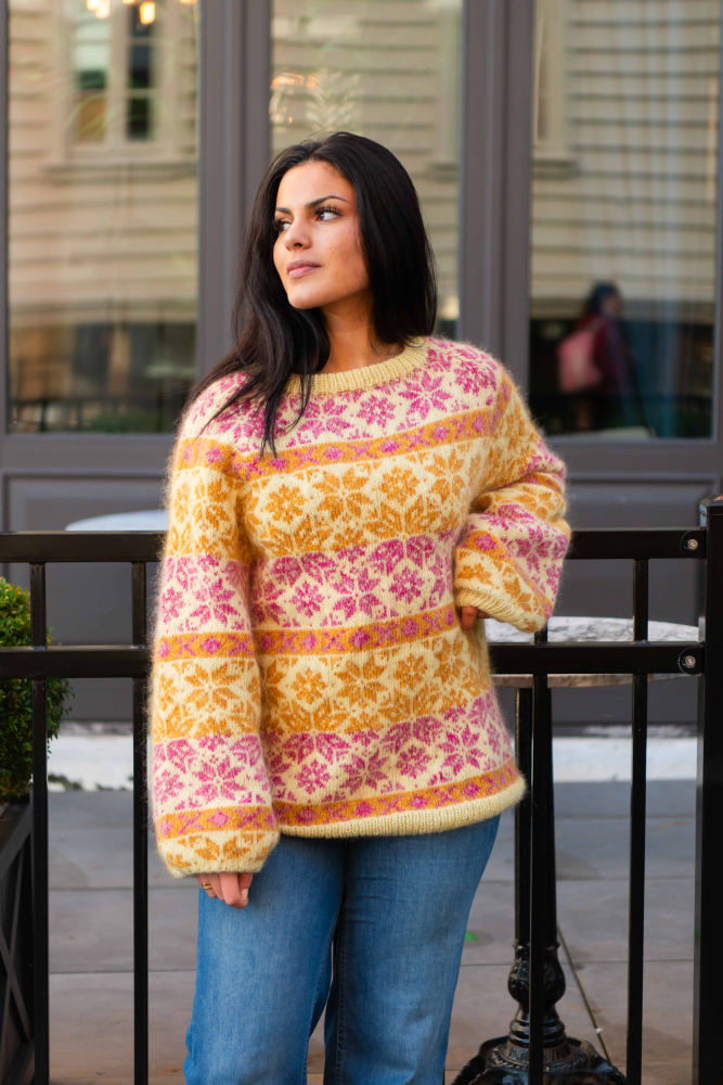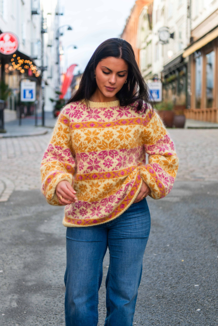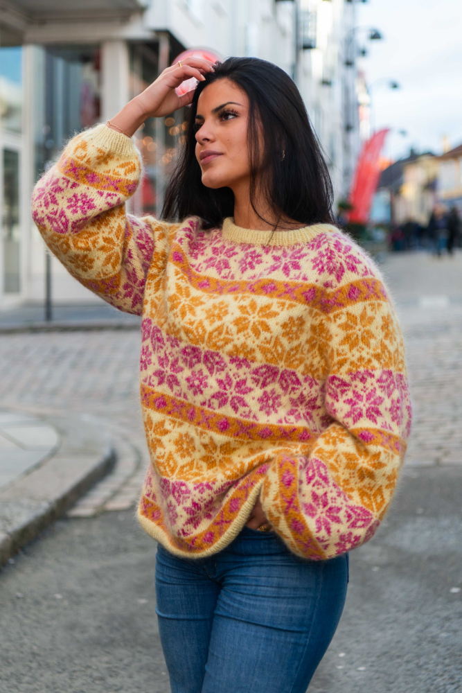 Du kan ändra färg på stickpaketet - välj först den storlek du vill sticka så visas färgvalen nedanför. OBS! Stickmönstret levereras alltid i stickpaketets originalfärger: ljusgul, rosa, honungsgul, vanilj, koral och gul