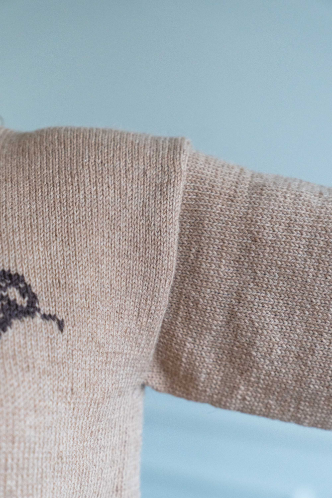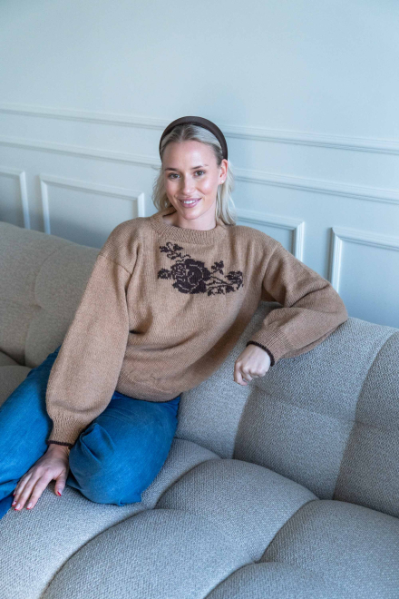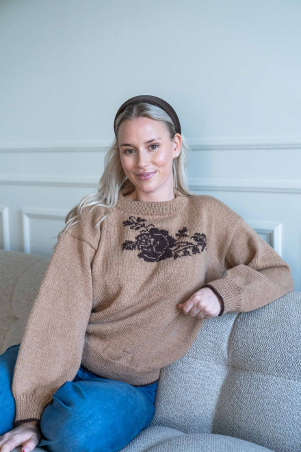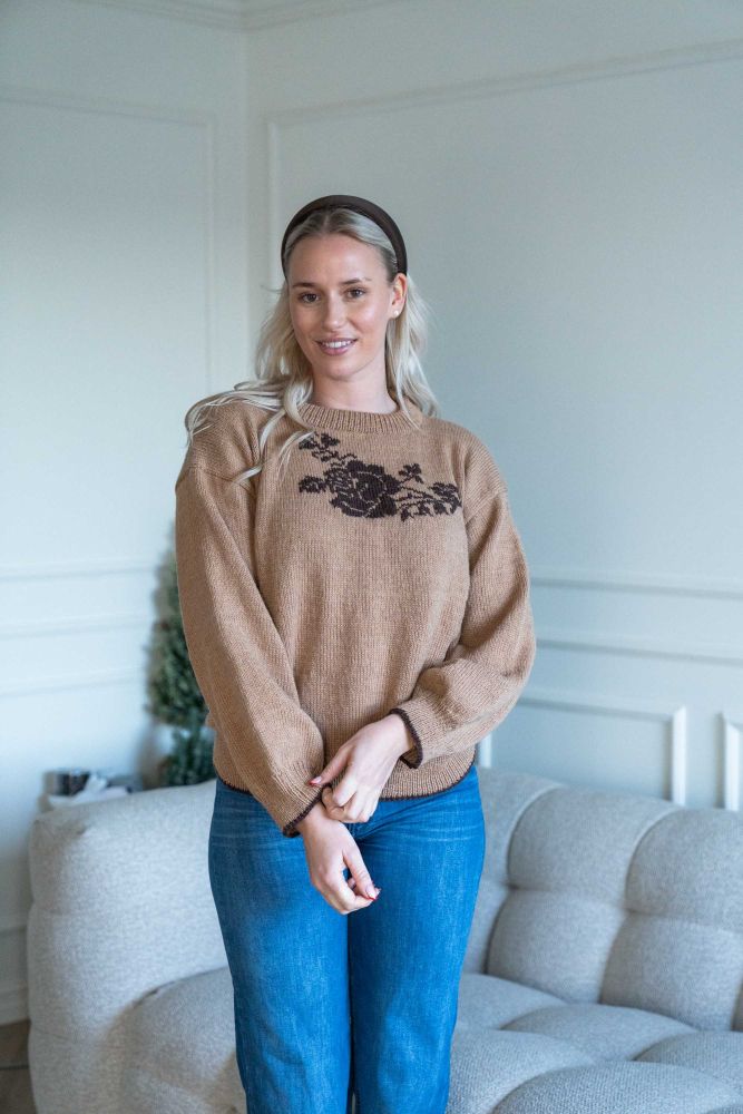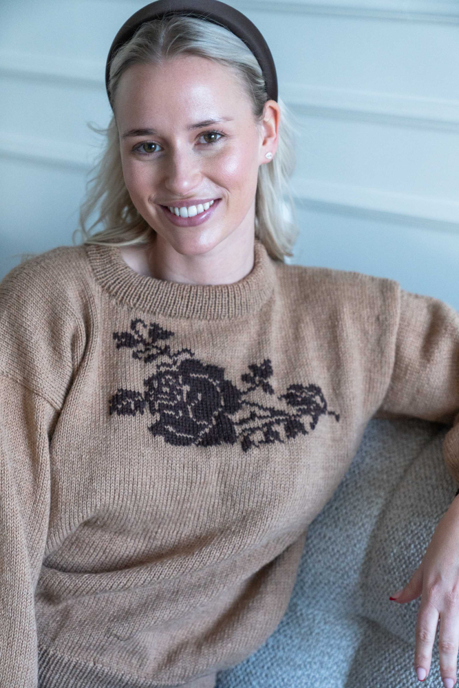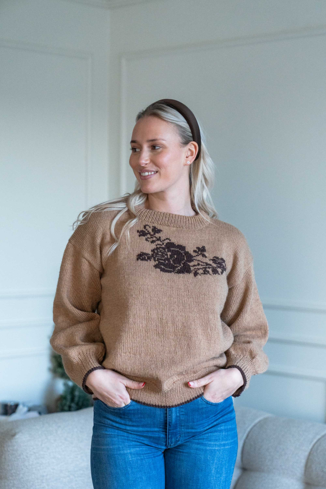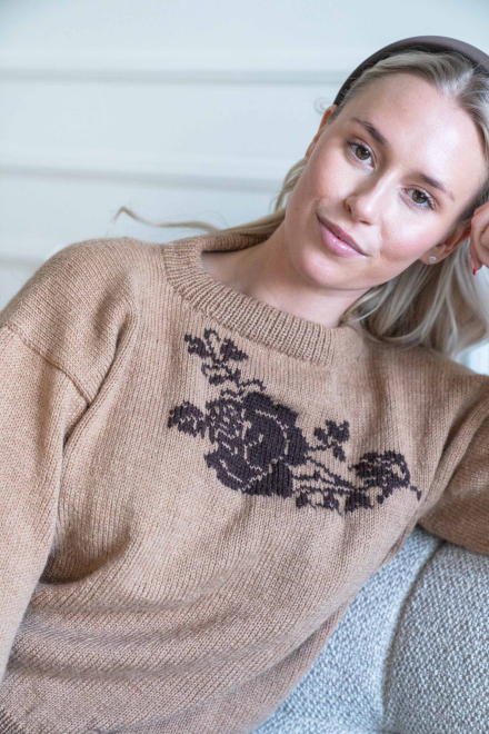 Enkel jumper med rosmotiv fram som stickas med intarsiastickning eller sys på med maskstygn på slutet.