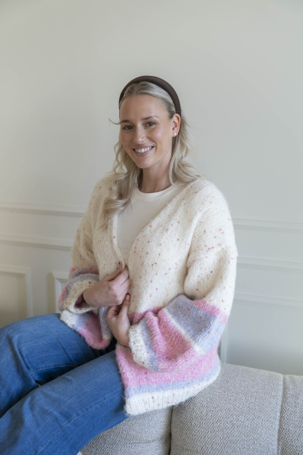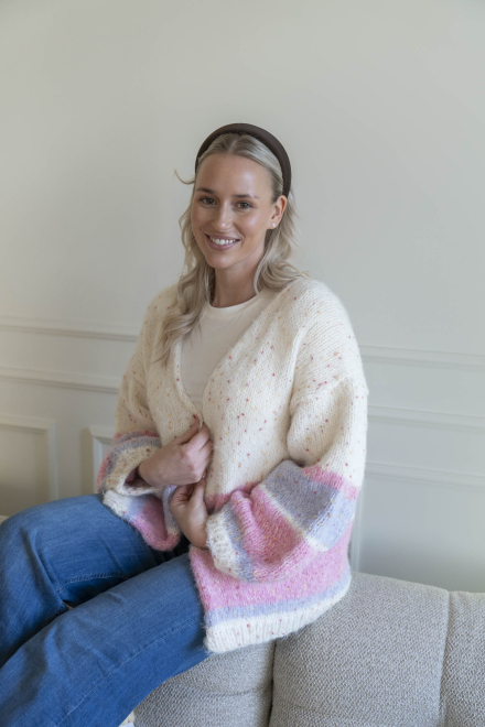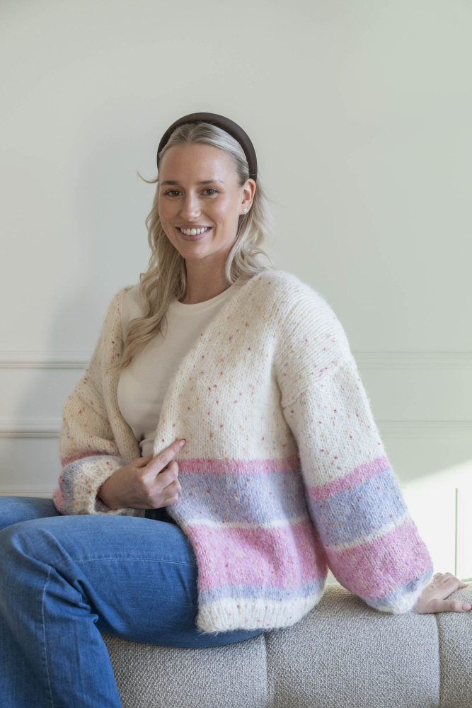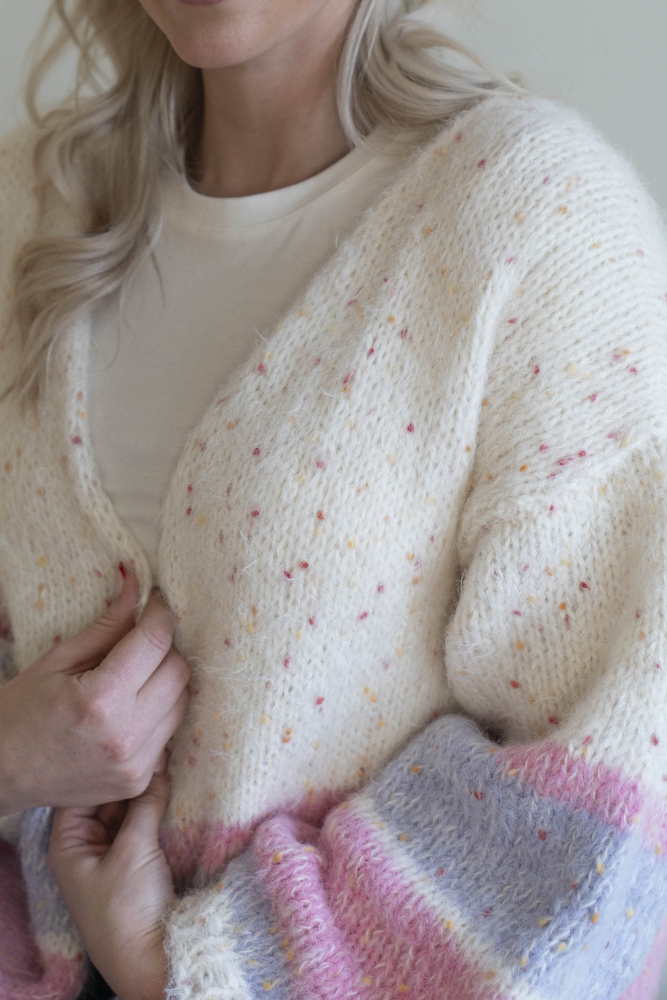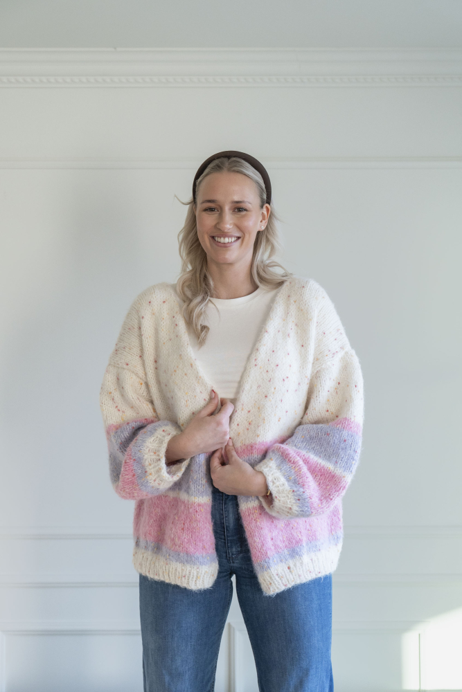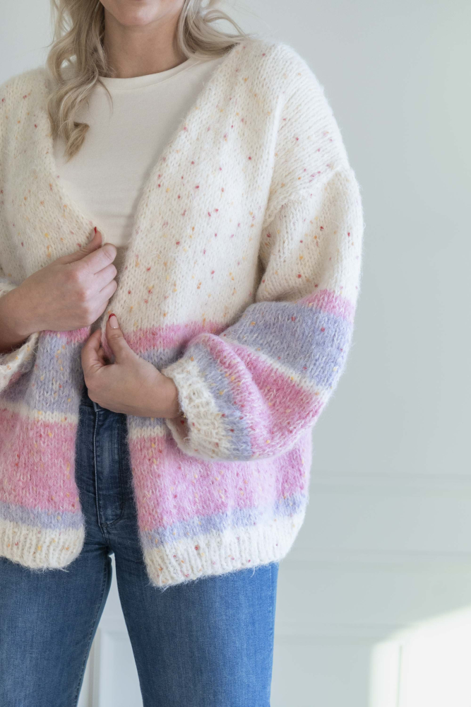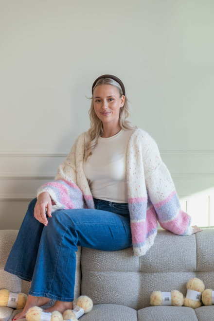 Du kan ändra färg på stickpaketet - välj först den storlek du vill sticka så visas färgvalen nedanför. OBS! Stickmönstret levereras alltid i stickpaketets originalfärg: vit, rosa, lila och blush white