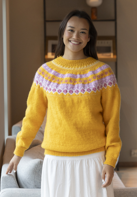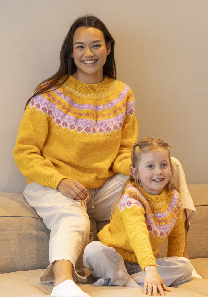 Du kan ändra färg på stickpaketet - välj först den storlek du vill sticka så visas färgvalen nedanför. OBS! Stickmönstret levereras alltid i stickpaketets originalfärger: gul, vit, gammelrosa och rosa