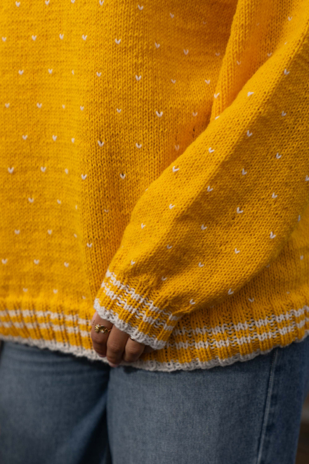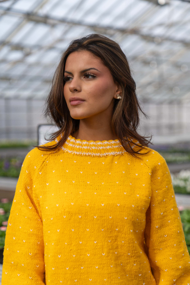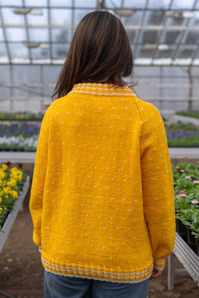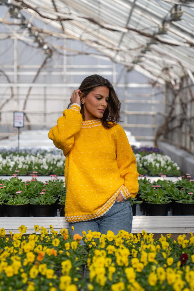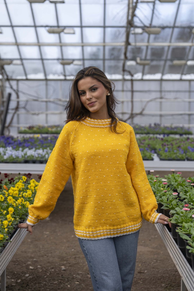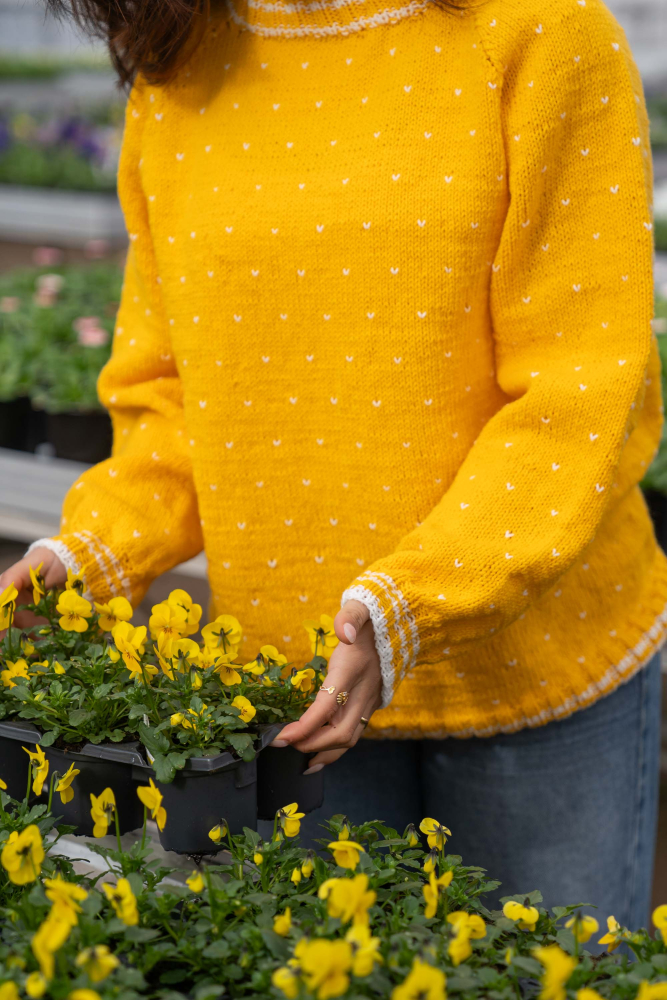 Du kan ändra färg på stickpaketet - välj först den storlek du vill sticka så visas färgvalen nedanför. OBS! Stickmönstret levereras alltid i stickpaketets originalfärger: solros och vit