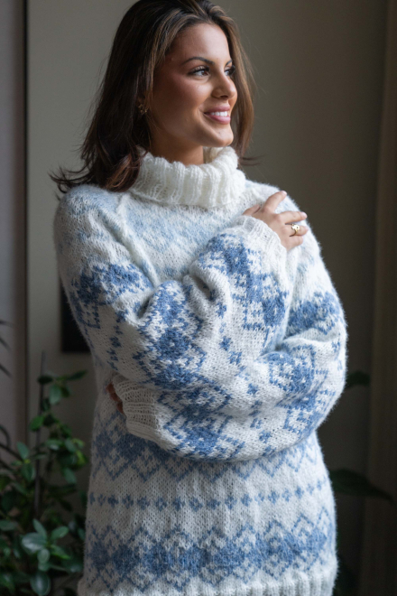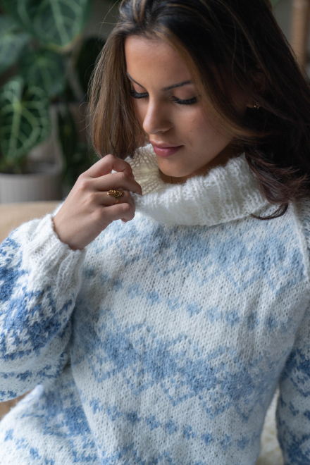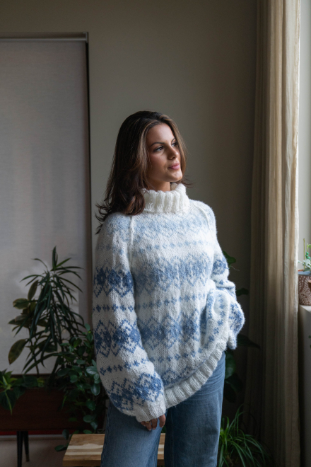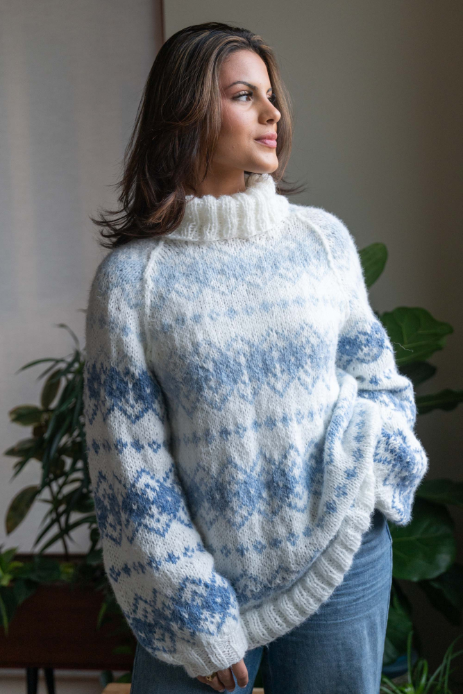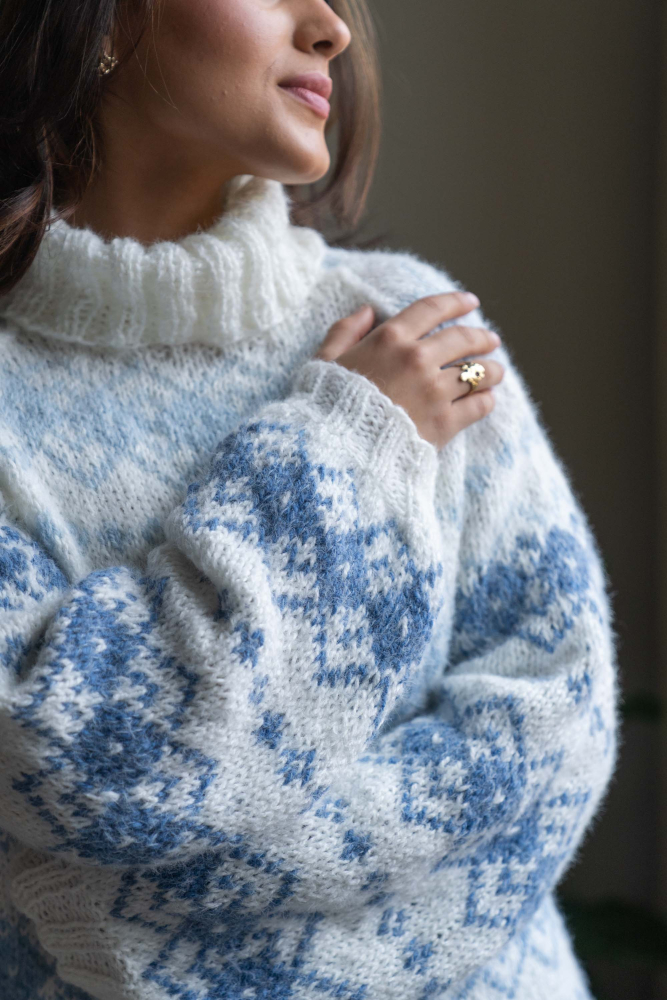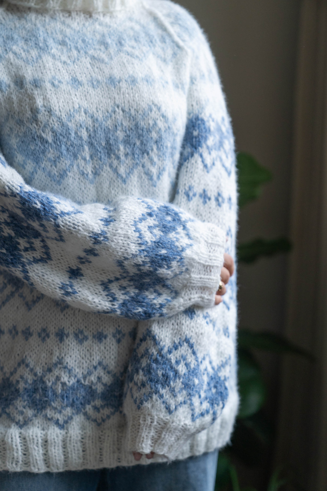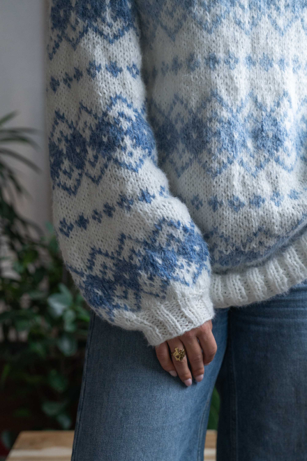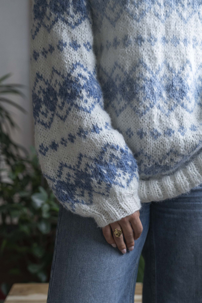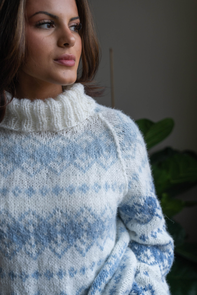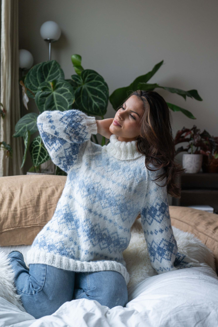 Du kan ändra färg på stickpaketet - välj först den storlek du vill sticka så visas färgvalen nedanför. OBS! Stickmönstret levereras alltid i stickpaketets originalfärger: white och denim dream