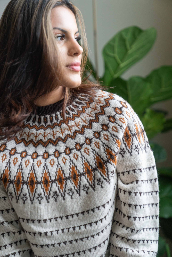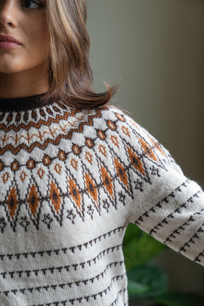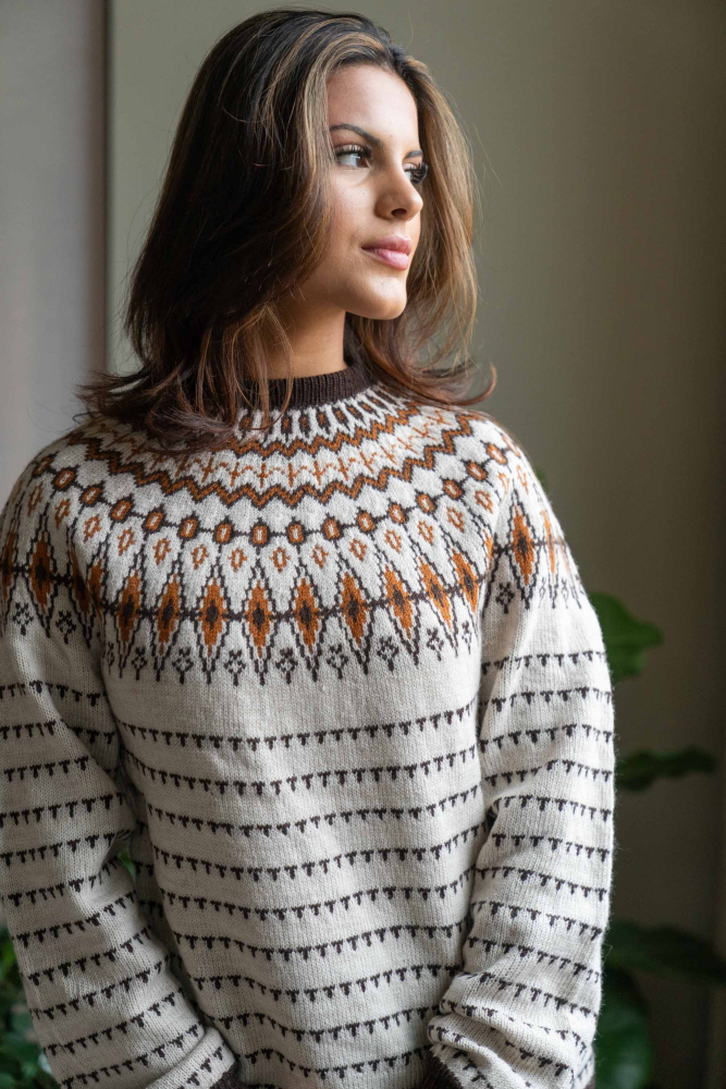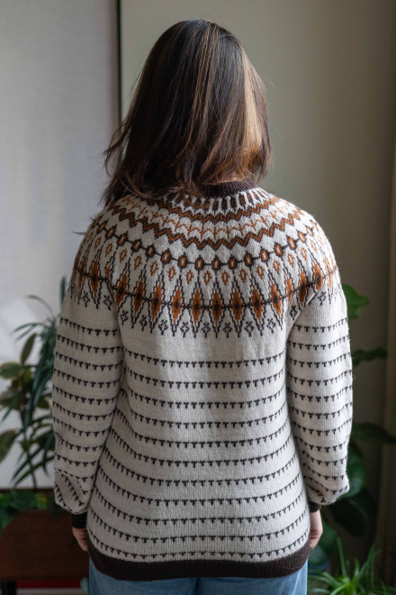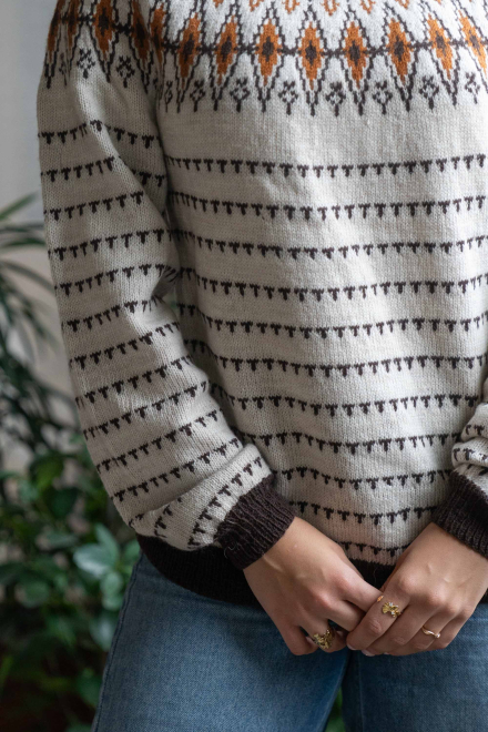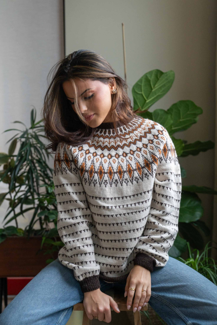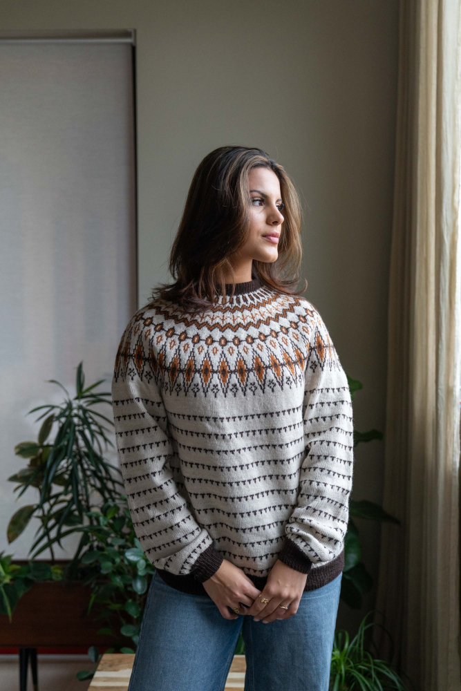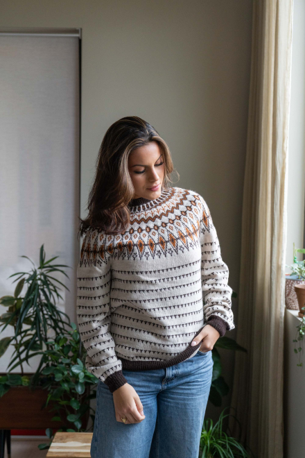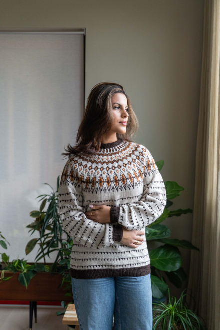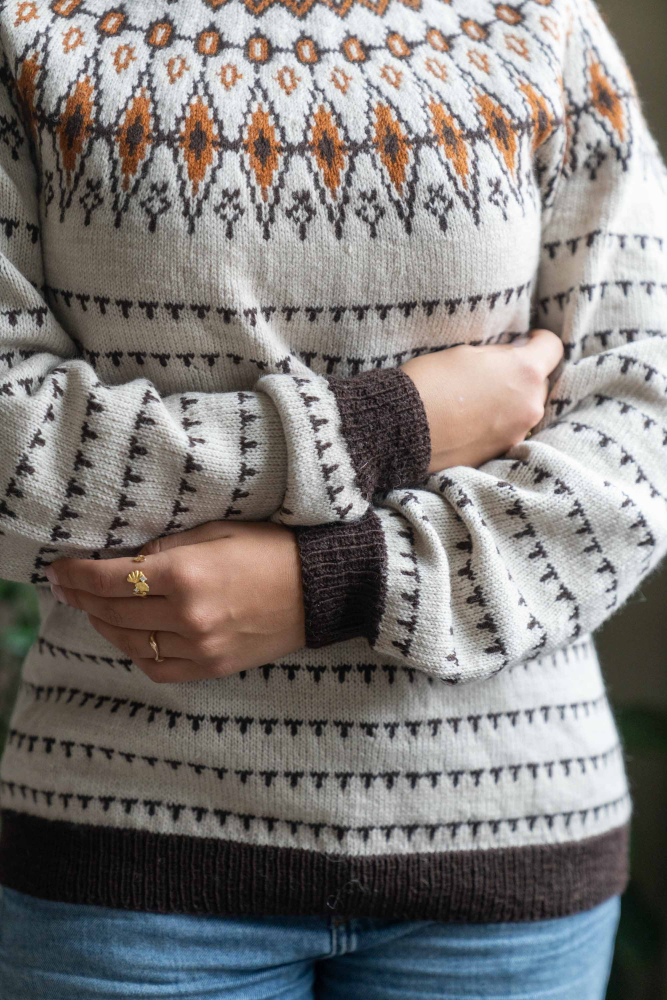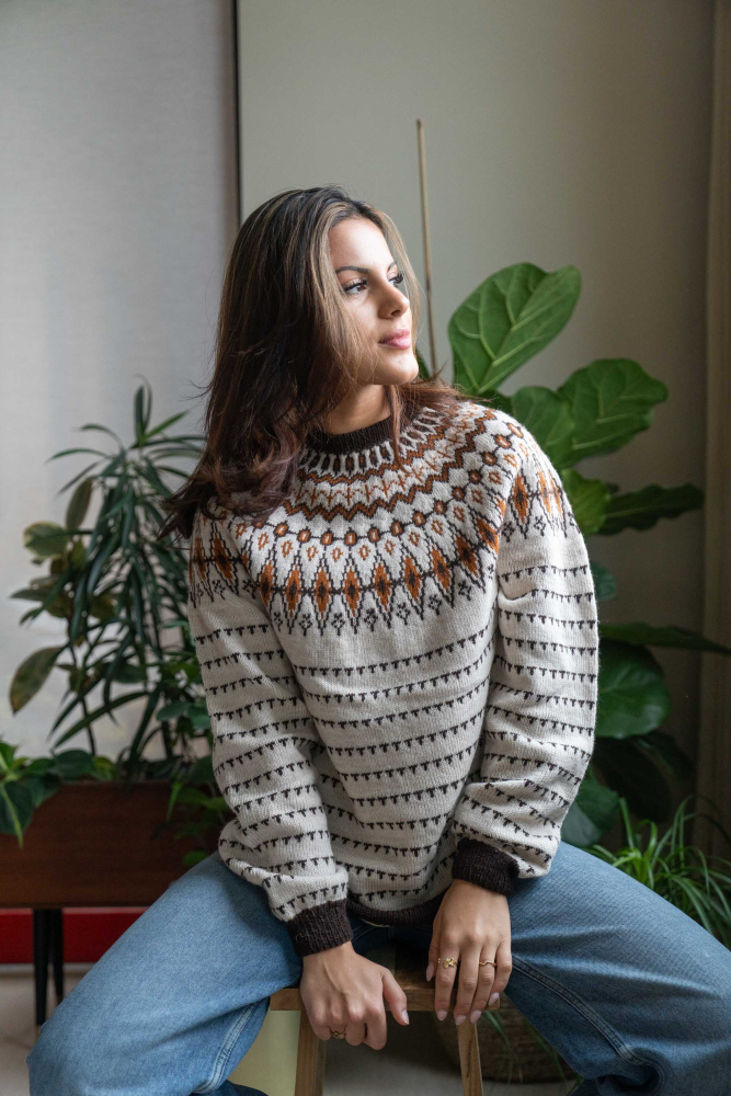 Du kan ändra färg på stickpaketet - välj först den storlek du vill sticka så visas färgvalen nedanför. OBS! Stickmönstret levereras alltid i stickpaketets originalfärger: ljusbeige melange, brun och saffran