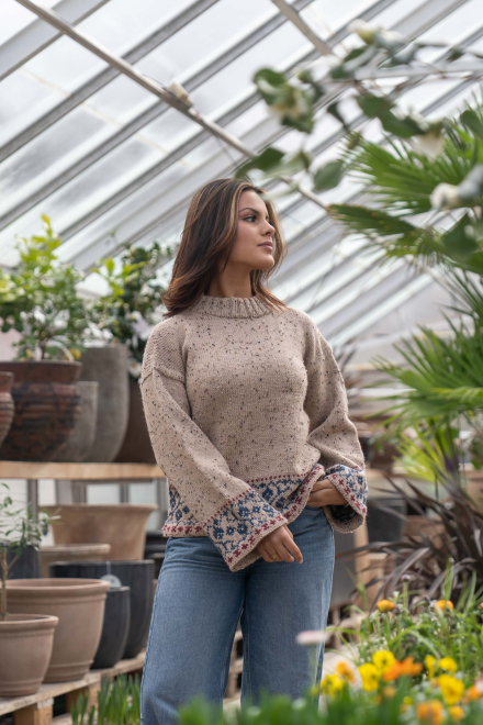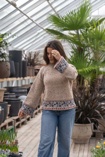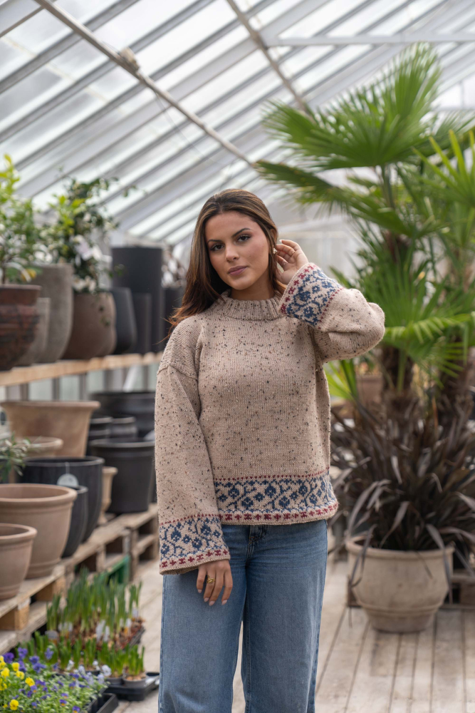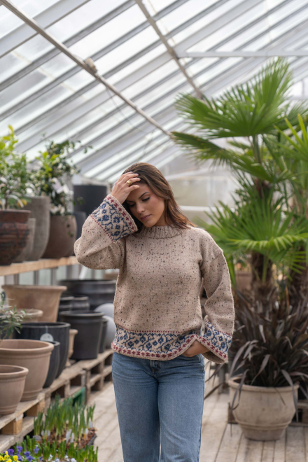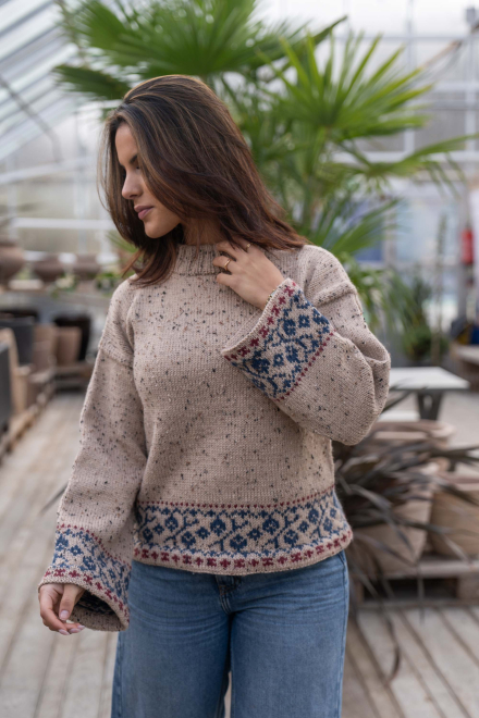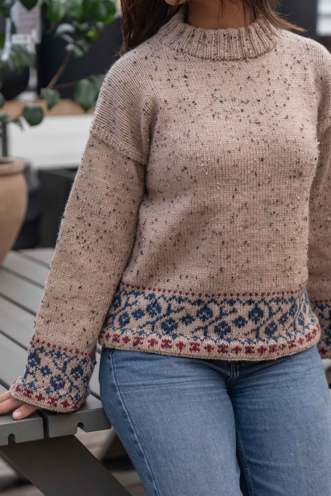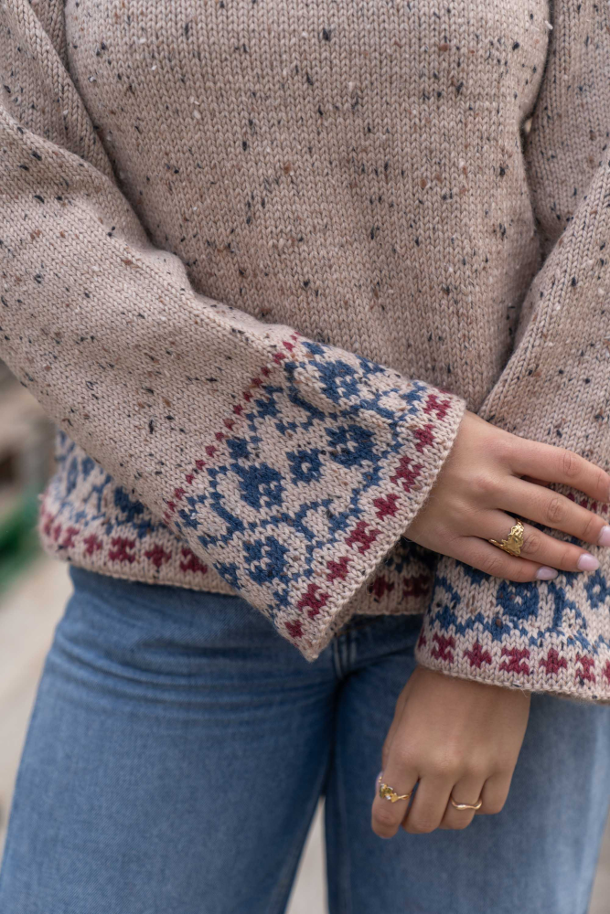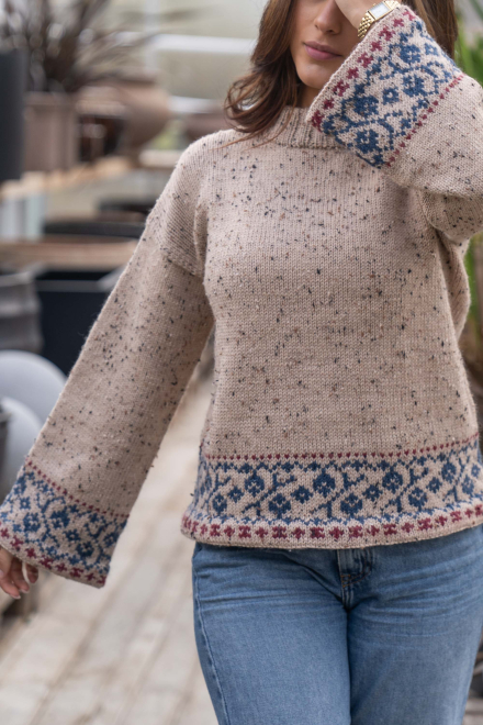 Du kan ändra färg på stickpaketet - välj först den storlek du vill sticka så visas färgvalen nedanför. OBS! Stickmönstret levereras alltid i stickpaketets originalfärger: ljusbeige, indigo och mörk röd