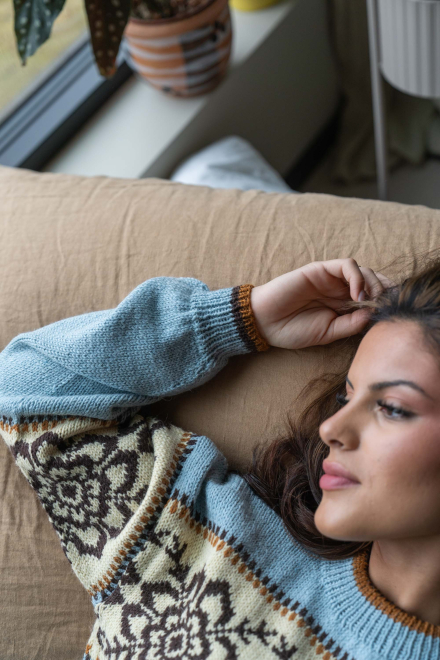 Du kan ändra färg på stickpaketet - välj först den storlek du vill sticka så visas färgvalen nedanför. OBS! Stickmönstret levereras alltid i stickpaketets originalfärger: turmalin, vanilj, saffran och mörkbrun