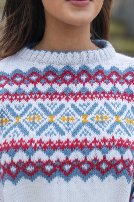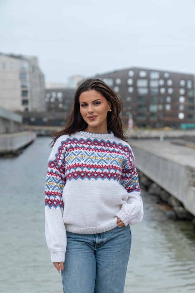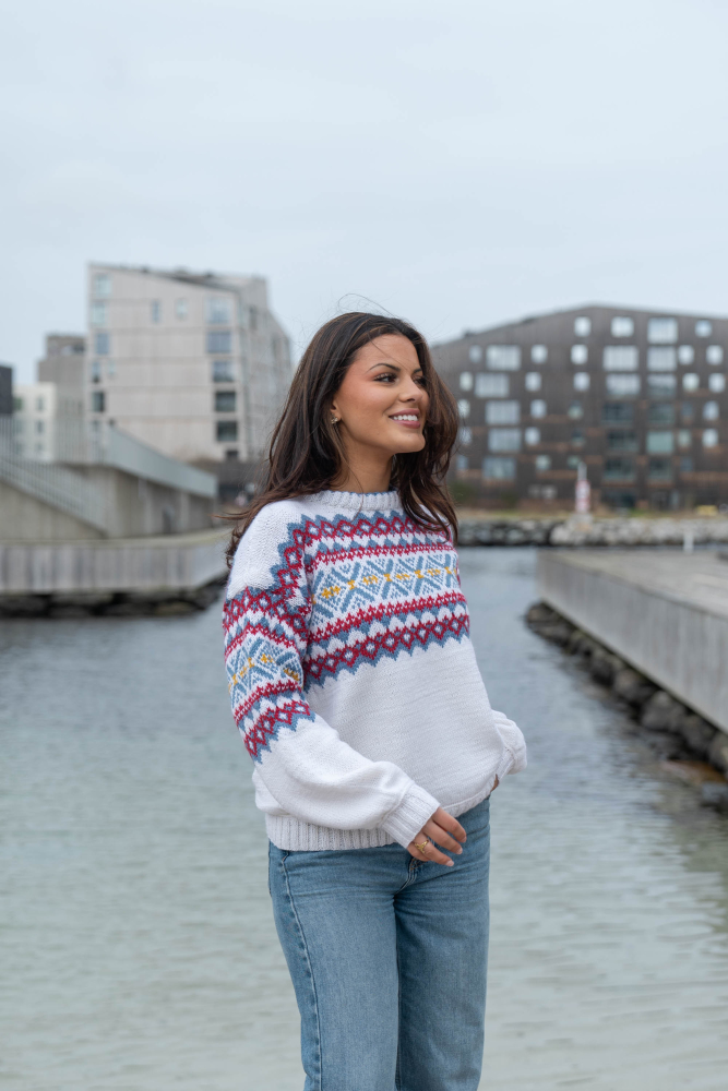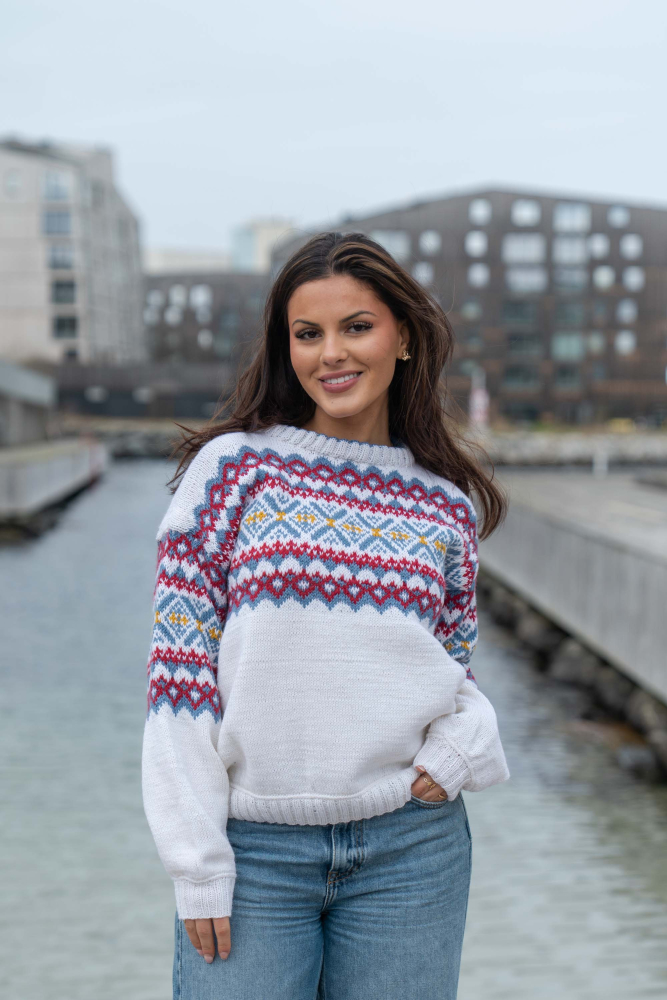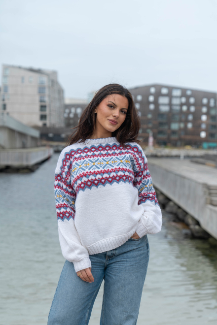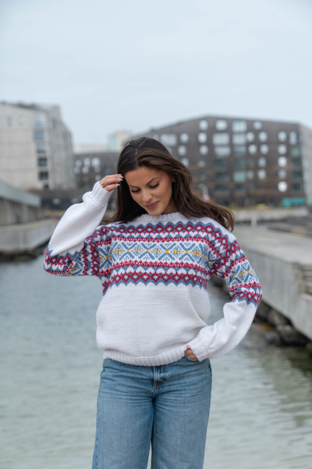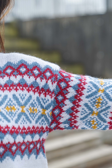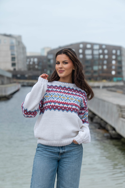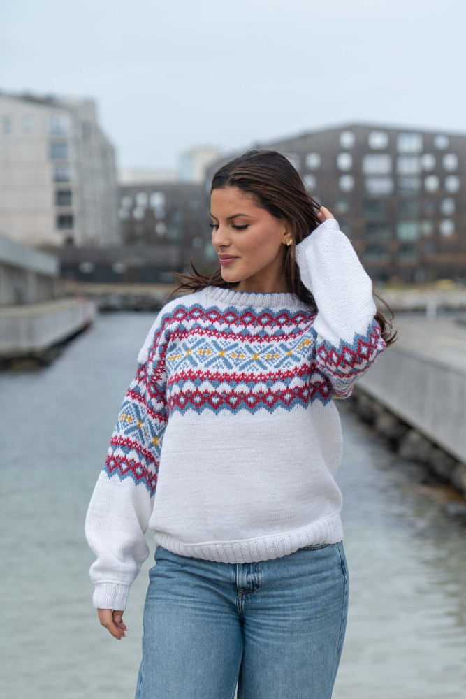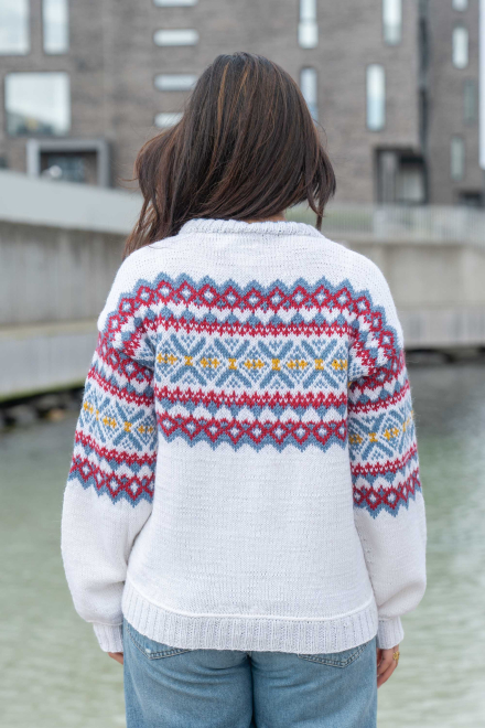 Du kan ändra färg på stickpaketet - välj först den storlek du vill sticka så visas färgvalen nedanför. OBS! Stickmönstret levereras alltid i stickpaketets originalfärger: vit, denim, djup röd och solros