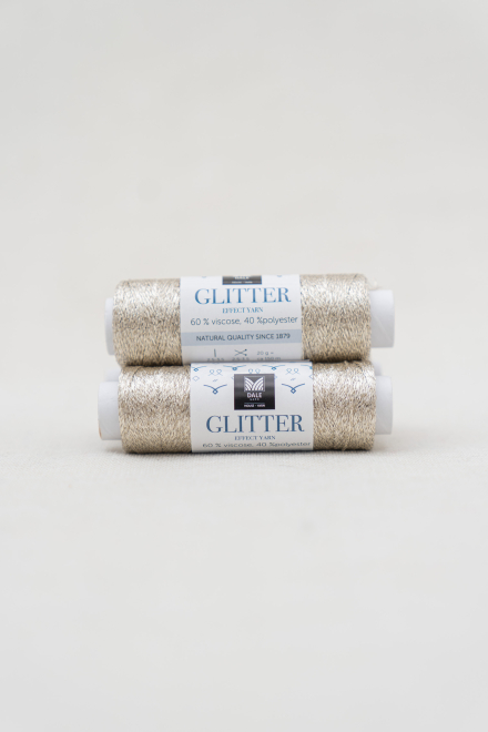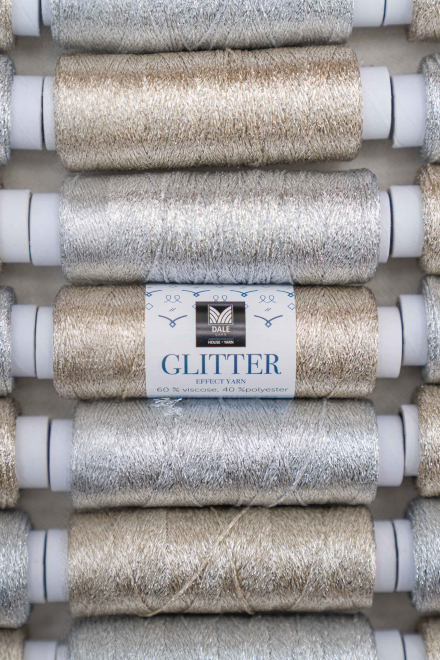 Glitter finns i guld och silver och är ett effektgarn i 60% viskos, som är en regenererad fiber gjord av cellulosa (träfiber), och 40% metallisk, syntetisk polyester. Glitter passar lika bra för både stickning och virkning – ensamt eller tillsammans med något av våra andra garn. Glitter passar perfekt för festtoppar och jumprar. Det ger en fantastisk effekt i accessoarer och i klassiska muddar. Och det är självklart ett strålande val till stickat och virkat jul- och nyårspynt.